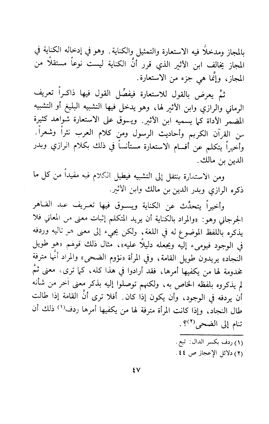 الضحى» والمراد أنّها مترفة مخدومة لها من يكفيها أمرها، فقد أرادوا في هذا كله، كما ترى، معنى ثمّ لم يذكروه بلفظه الخاص به، ولكنهم توصلوا إليه بذكر معنى آخر من شأنه أن يردفه في الوجود، وأن يكون إذا كان. أفلا ترى أنّ القامة إذا طالت طال النجاد، وإذا كانت المرأة مترفة لها من يكفيها أمرها ردف (¬1) ذلك أن تنام إلى الضحى (¬2)؟.