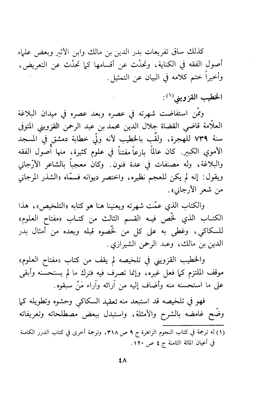 والخطيب القزويني في تلخيصه لم يقف من كتاب «مفتاح العلوم» موقف الملتزم كما فعل غيره، وإنما تصرف فيه فترك ما لم يستحسنه وأبقى على ما استحسنه منه وأضاف إليه من آرائه وآراء من سبقوه.