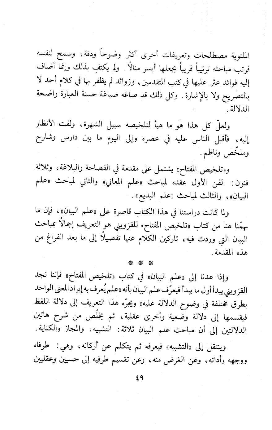 ولما كانت دراستنا في هذا الكتاب قاصرة على «علم البيان»، فإن ما يهمّنا هنا من كتاب «تلخيص المفتاح» للقزويني هو التعريف إجمالا بمباحث البيان التي وردت فيه، تاركين الكلام عنها تفصيلا إلى ما بعد الفراغ من هذه المقدمة.