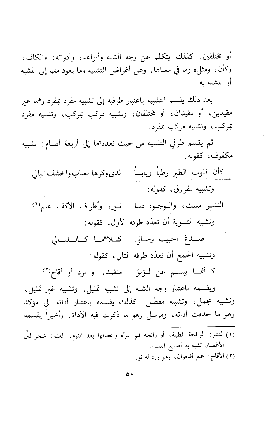 أو مختلفين. كذلك يتكلم عن وجه الشبه وأنواعه، وأدواته: «الكاف، وكأن، ومثل» وما في معناها، وعن أغراض التشبيه وما يعود منها إلى المشبه أو المشبه به.