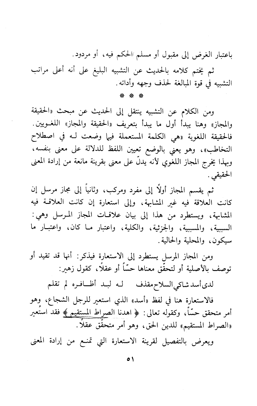 ومن الكلام عن التشبيه ينتقل إلى الحديث عن مبحث «الحقيقة والمجاز» وهنا يبدأ أول ما يبدأ بتعريف «الحقيقة والمجاز» اللغويين.