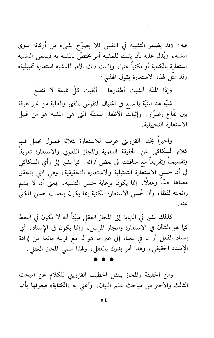 ومن الحقيقة والمجاز ينتقل الخطيب القزويني للكلام عن المبحث الثالث والأخير من مباحث علم البيان، وأعني به «الكناية» فيعرفها بأنها