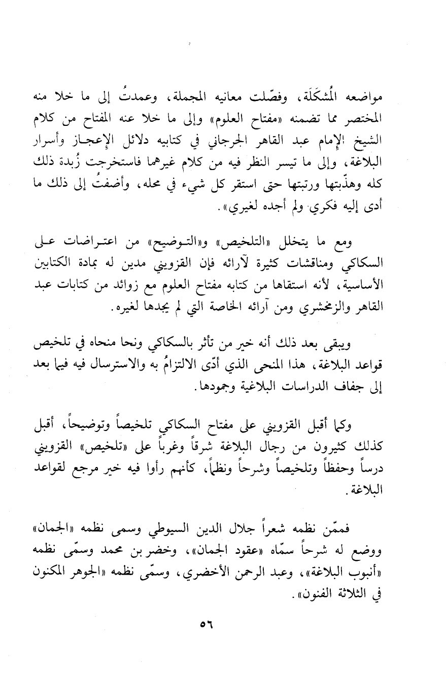 ويبقى بعد ذلك أنه خير من تأثر بالسكاكي ونجا منحاه في تلخيص قواعد البلاغة، هذا المنحى الذي أدّى الالتزام به والاسترسال فيه فيما بعد إلى جفاف الدراسات البلاغية وجمودها.