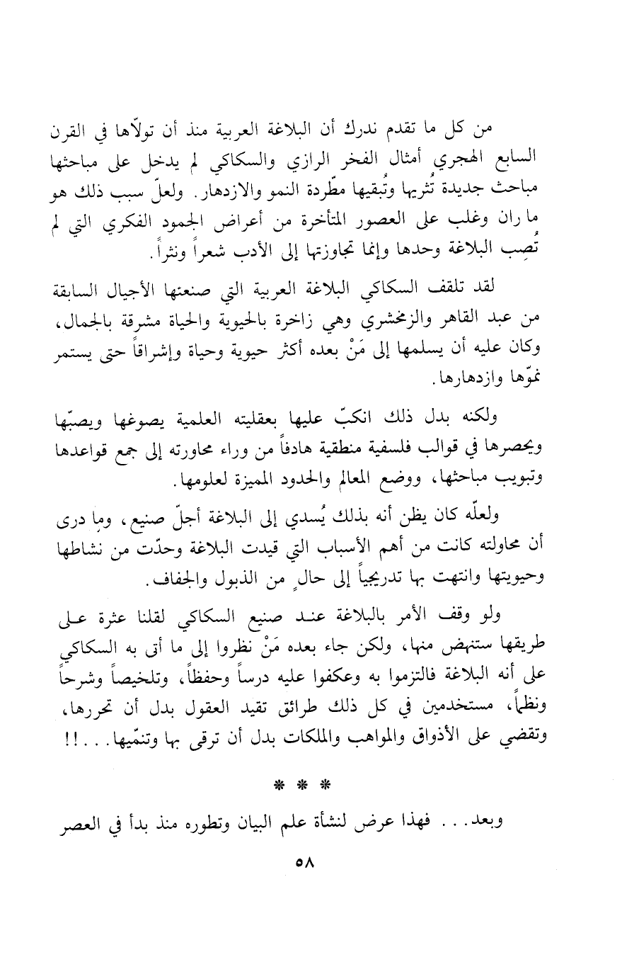 ولو وقف الأمر بالبلاغة عند صنيع السكاكي لقلنا عثرة على طريقها ستنهض منها، ولكن جاء بعده من نظروا إلى ما أتى به السكاكي على أنه البلاغة فالتزموا به وعكفوا عليه درسا وحفظا، وتلخيصا وشرحا ونظما، مستخدمين في كل ذلك طرائق تقيد العقول بدل أن تحررها، وتقضي على الأذواق والمواهب والملكات بدل أن ترقى بها وتنمّيها ... !!