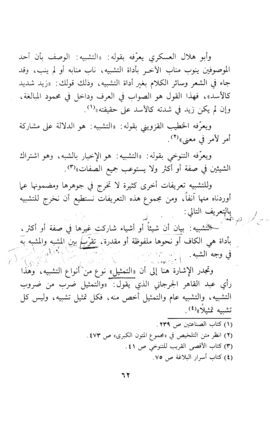 وأبو هلال العسكري يعرفّه بقوله: «التشبيه: الوصف بأن أحد الموصوفين ينوب مناب الآخر بأداة التشبيه، ناب منابه أو لم ينب، وقد جاء في الشعر وسائر الكلام بغير أداة التشبيه، وذلك قولك: «زيد شديد كالأسد»، فهذا القول هو الصواب في العرف وداخل في محمود المبالغة، وإن لم يكن زيد في شدته كالأسد على حقيقته» (¬1).