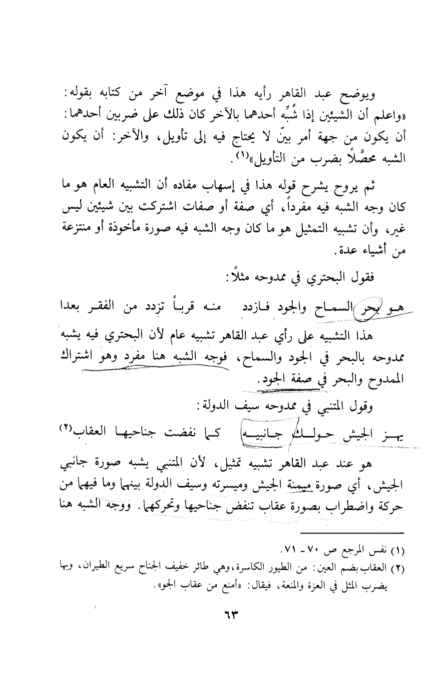 هو عند عبد القاهر تشبيه تمثيل، لأن المتنبي يشبه صورة جانبي الجيش، أي صورة ميمنة الجيش وميسرته وسيف الدولة بينهما وما فيهما من حركة واضطراب بصورة عقاب تنفض جناحيها وتحركهما. ووجه الشبه هنا