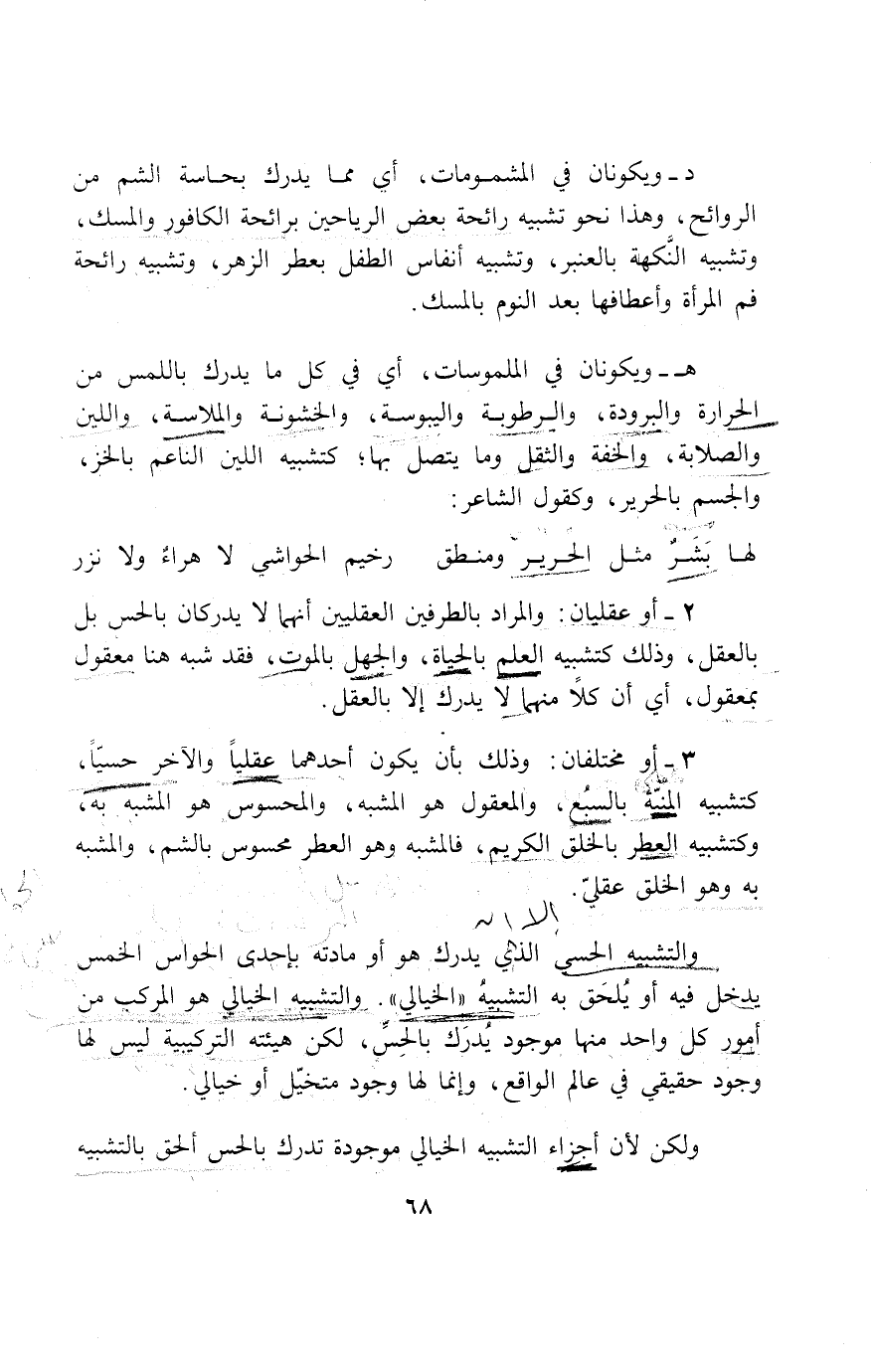 د- ويكونان في المشمومات، أي مما يدرك بحاسة الشم من الروائح، وهذا نحو تشبيه رائحة بعض الرياحين برائحة الكافور والمسك، وتشبيه النّكهة بالعنبر، وتشبيه أنفاس الطفل بعطر الزهر، وتشبيه رائحة فم المرأة وأعطافها بعد النوم بالمسك.