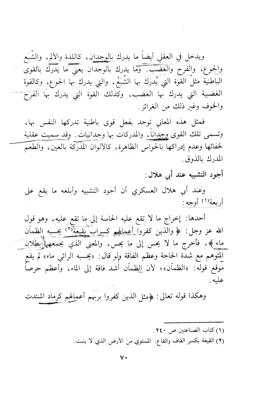 أحدها: إخراج ما لا تقع عليه الحاسة إلى ما تقع عليه، وهو قول الله عز وجل: وَالَّذِينَ كَفَرُوا أَعْمالُهُمْ كَسَرابٍ بِقِيعَةٍ (¬2) يَحْسَبُهُ الظَّمْآنُ ماءً، فأخرج ما لا يحس إلى ما يحس، والمعنى الذي يجمعهما بطلان المتوهم مع شدة الحاجة وعظم الفاقة ولو قال: «يحسبه الرائي ماء» لم يقع موقع قوله: «الظمآن»؛ لأن الظمآن أشد فاقة إلى الماء، وأعظم حرصا عليه.