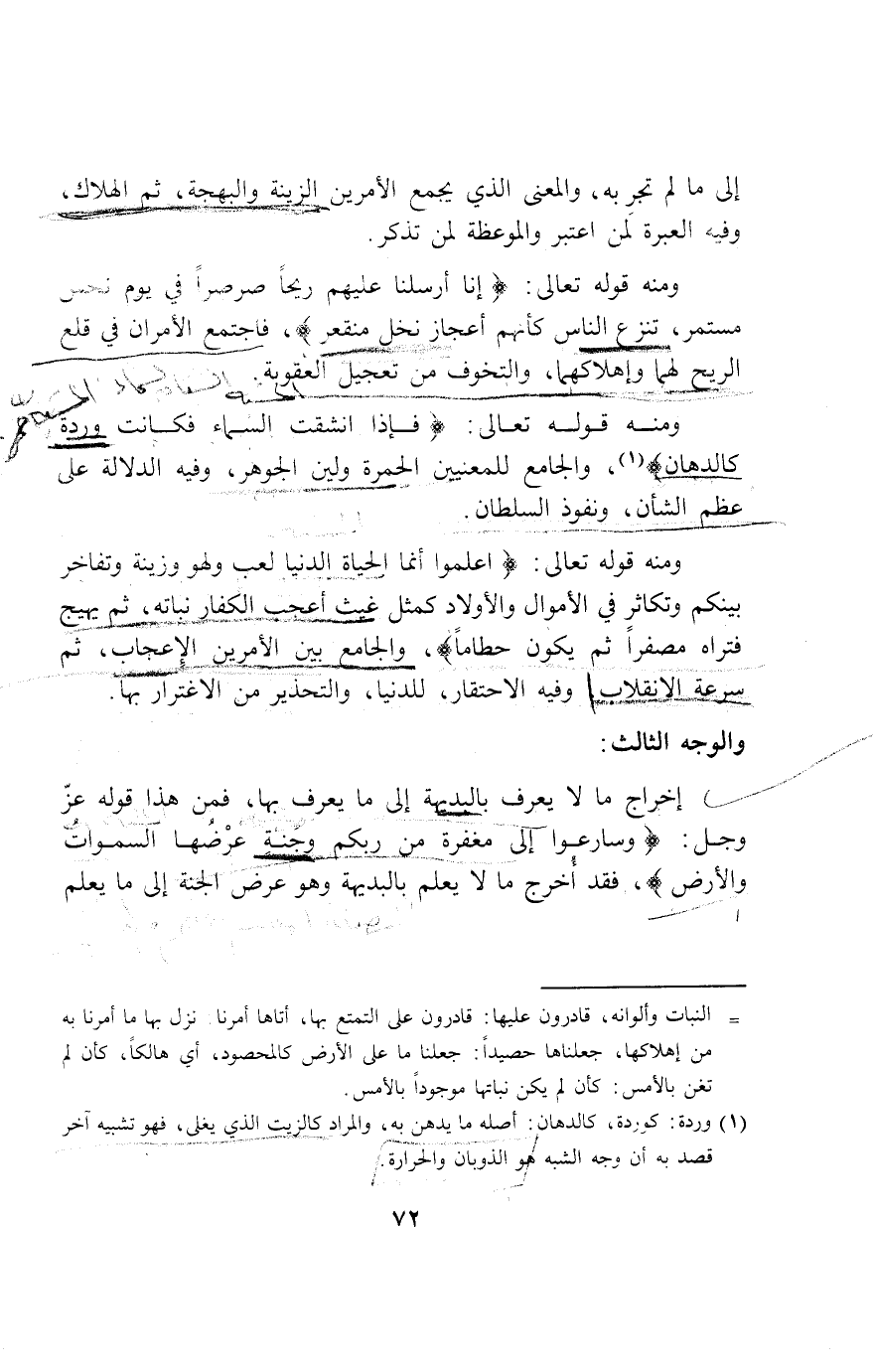 (¬1) وردة: كوردة، كالدهان: أصله ما يدهن به، والمراد كالزيت الذي يغلى، فهو تشبيه آخر قصد به أن وجه الشبه هو الذوبان والحرارة.