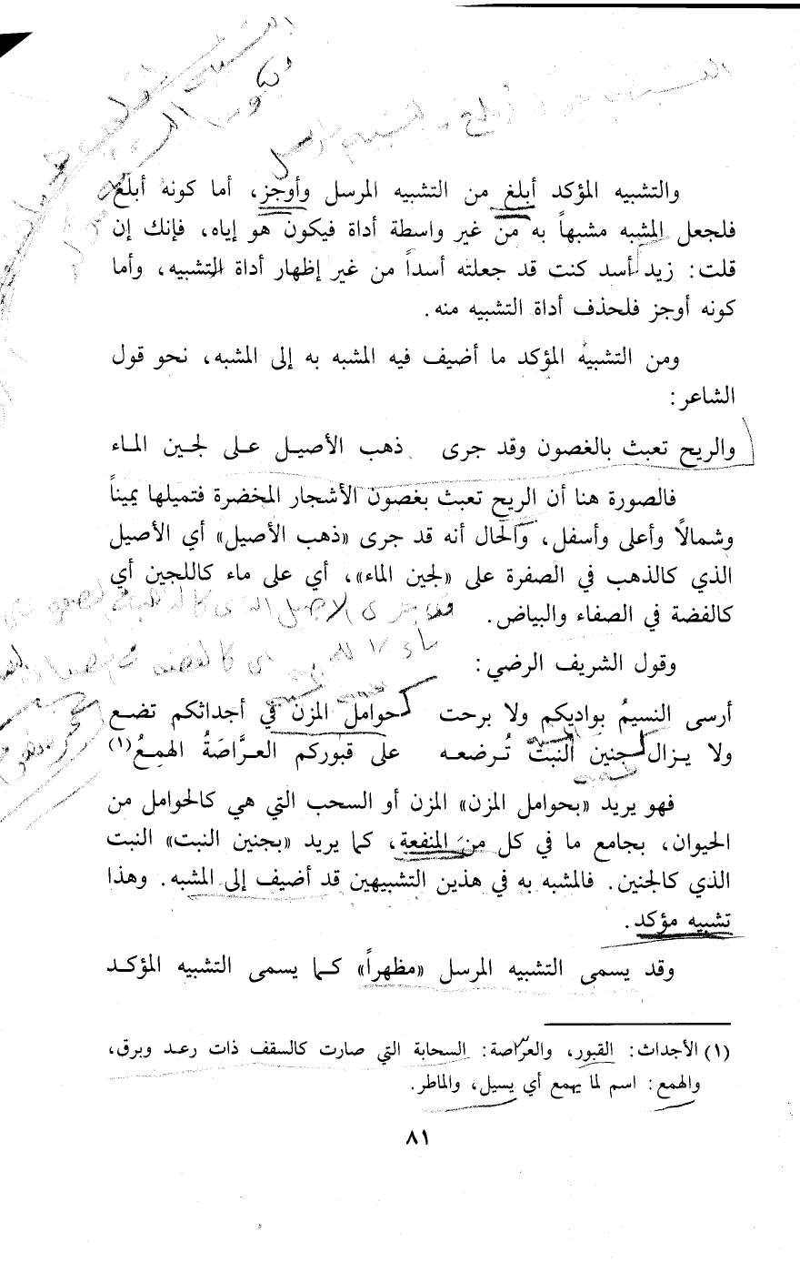 فهو يريد «بحوامل المزن» المزن أو السحب التي هي كالحوامل من الحيوان، بجامع ما في كل من المنفعة، كما يريد «بجنين النبت» النبت الذي كالجنين. فالمشبه به في هذين التشبيهين قد أضيف إلى المشبه. وهذا تشبيه مؤكد.