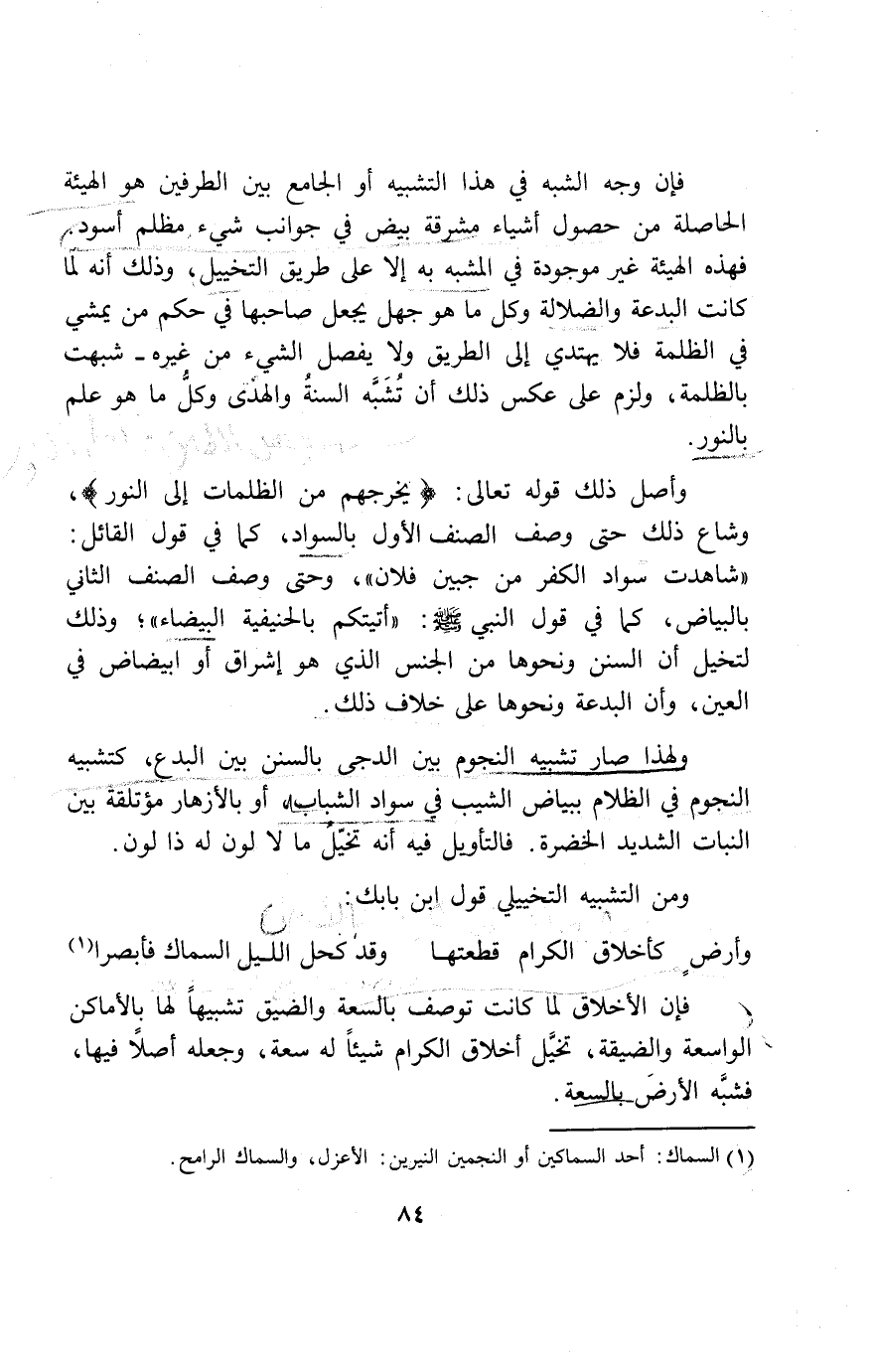 فهذه الهيئة غير موجودة في المشبه به إلا على طريق التخييل، وذلك أنه لما كانت البدعة والضلالة وكل ما هو جهل يجعل صاحبها في حكم من يمشي في الظلمة فلا يهتدي إلى الطريق ولا يفصل الشيء من غيره- شبهت بالظلمة، ولزم على عكس ذلك أن تشبّه السنة والهدى وكلّ ما هو علم بالنور.