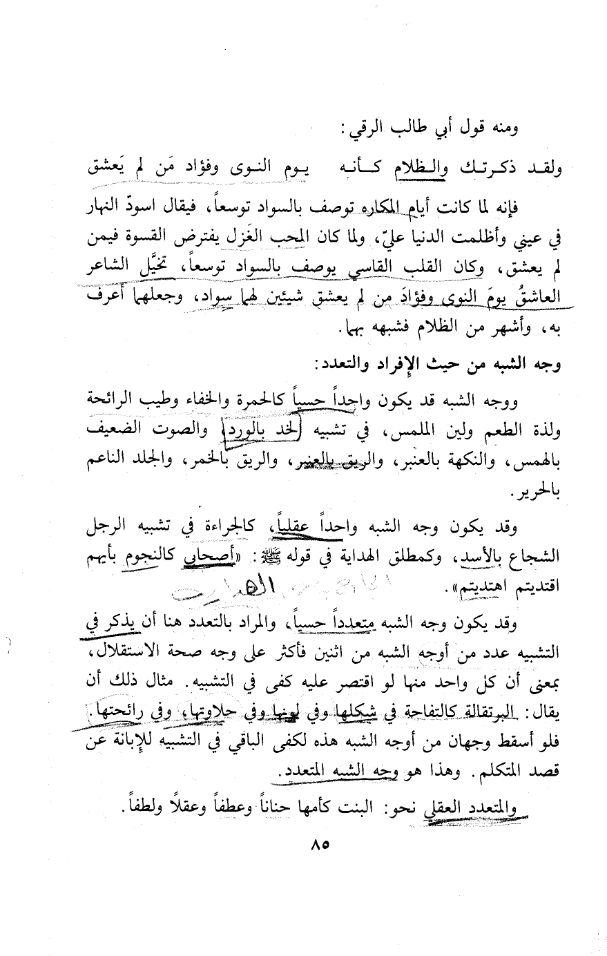 فلو أسقط وجهان من أوجه الشبه هذه لكفى الباقي في التشبيه للإبانة عن قصد المتكلم. وهذا هو وجه الشبه المتعدد.