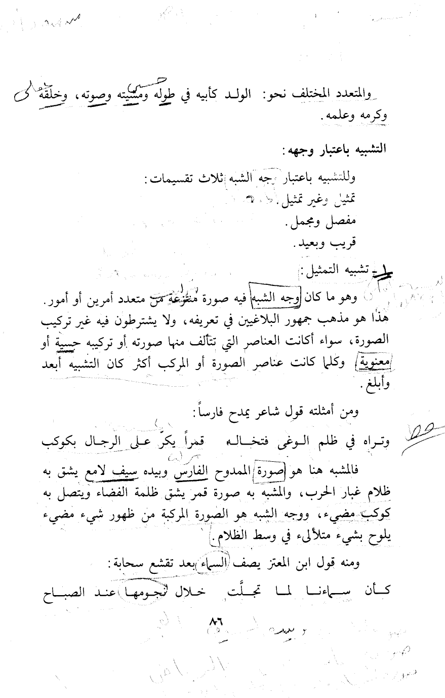 فالمشبه هنا هو صورة الممدوح الفارس وبيده سيف لا مع يشق به ظلام غبار الحرب، والمشبه به صورة قمر يشق ظلمة الفضاء ويتصل به كوكب مضيء، ووجه الشبه هو الصورة المركبة من ظهور شيء مضيء يلوح بشيء متلألئ في وسط الظلام.