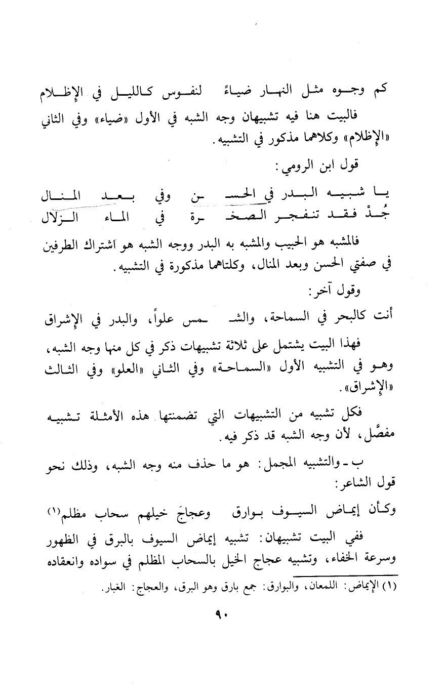 فهذا البيت يشتمل على ثلاثة تشبيهات ذكر في كل منها وجه الشبه، وهو في التشبيه الأول «السماحة» وفي الثاني «العلو» وفي الثالث «الإشراق».