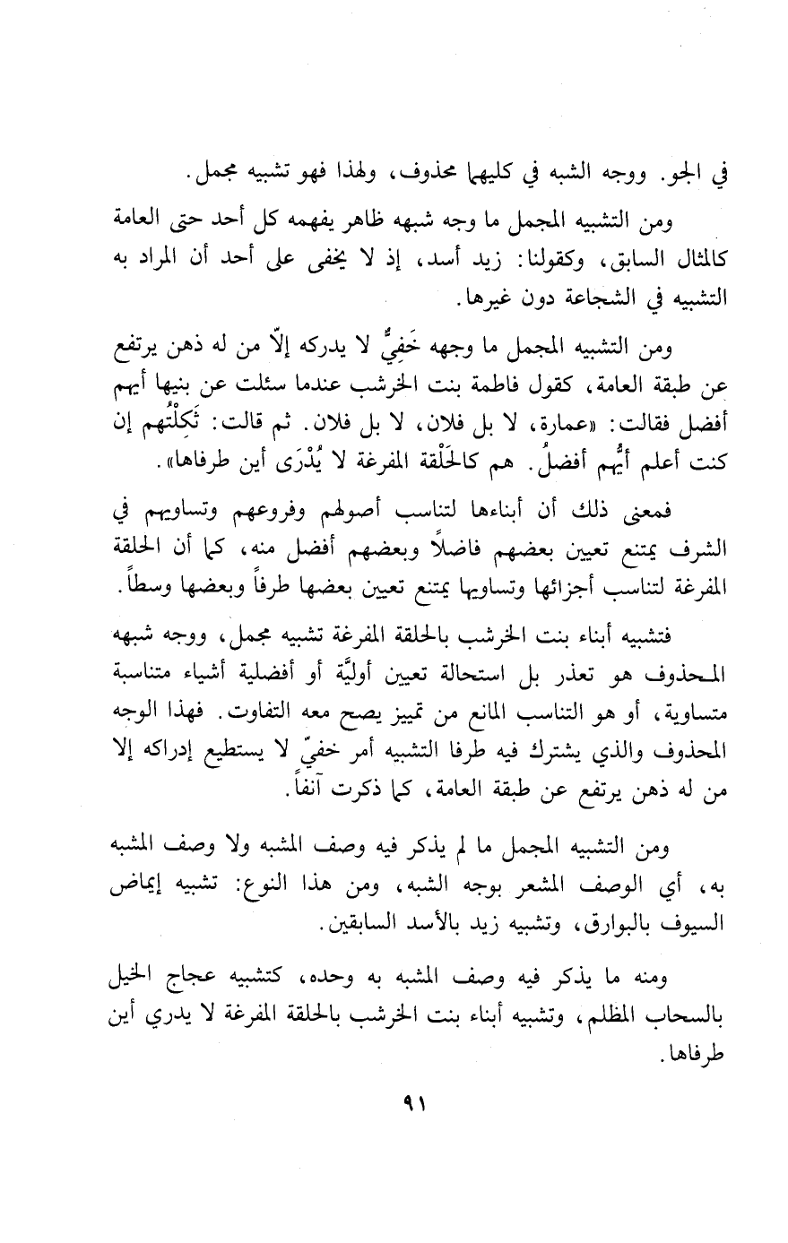 ومن التشبيه المجمل ما وجهه خفيّ لا يدركه إلّا من له ذهن يرتفع عن طبقة العامة، كقول فاطمة بنت الخرشب عند ما سئلت عن بنيها أيهم أفضل فقالت: «عمارة، لا بل فلان، لا بل فلان. ثم قالت: ثكلتهم إن كنت أعلم أيّهم أفضل. هم كالحلقة المفرغة لا يدرى أين طرفاها».