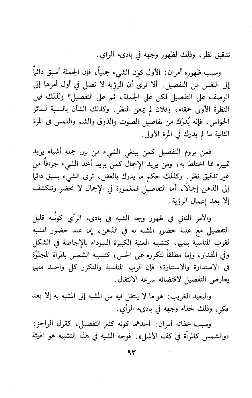 فمن يروم التفصيل كمن يبتغي الشيء من بين جملة أشياء يريد تمييزه مما اختلط به، ومن يريد الإجمال كمن يريد أخذ الشيء جزافا من غير تدقيق نظر. وكذلك حكم ما يدرك بالعقل، ترى الشيء يسبق دائما إلى الذهن إجمالا، أما التفاصيل فمغمورة في الإجمال لا تحضر وتنكشف إلا بعد إعمال الرؤية.