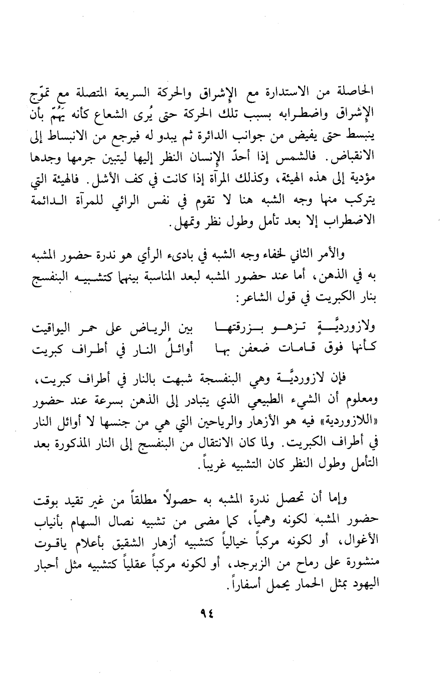 والأمر الثاني لخفاء وجه الشبه في بادئ الرأي هو ندرة حضور المشبه به في الذهن، أما عند حضور المشبه لبعد المناسبة بينهما كتشبيه البنفسج بنار الكبريت في قول الشاعر: