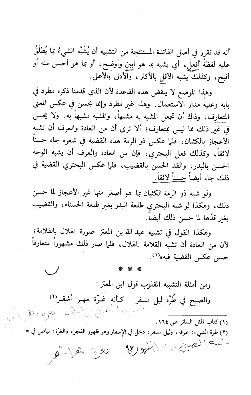 وهذا الموضع لا ينقض هذه القاعدة لأن الذي قدمنا ذكره مطرد في بابه وعليه مدار الاستعمال. وهذا غير مطرد وإنما يحسن في عكس المعنى المتعارف، وذاك أن تجعل المشبه به مشبها، والمشبه مشبها به. ولا يحسن في غير ذلك مما ليس بمتعارف؛ ألا ترى أن من العادة والعرف أن تشبه الأعجاز بالكثبان، فلما عكس ذو الرمة هذه القضية في شعره جاء حسنا لائقا، وكذلك فعل البحتري، فإن من العادة والعرف أن يشبه الوجه الحسن بالبدر، والقد الحسن بالقضيب، فلما عكس البحتري القضية في ذلك جاء أيضا حسنا لائقا.