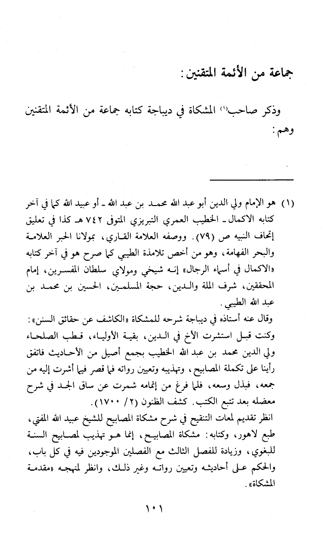 وَذكر صَاحب الْمشكاة فِي ديباجة كِتَابه جمَاعَة من الْأَئِمَّة المتقنين وهم