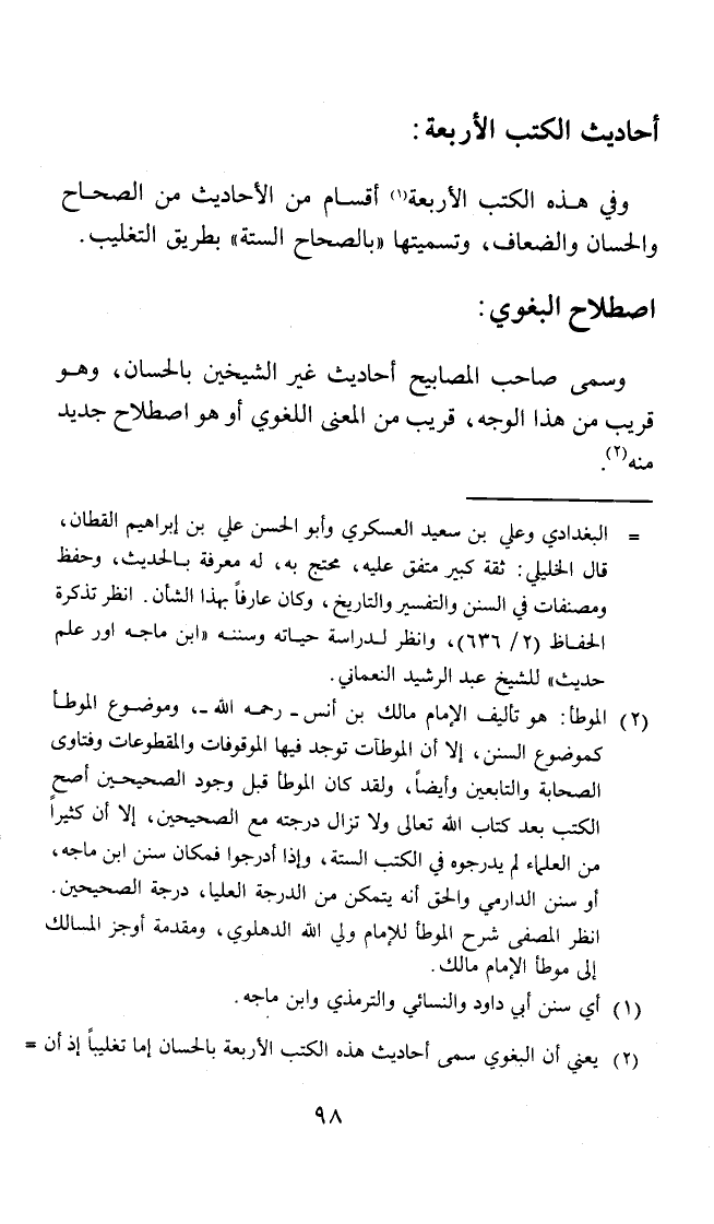 وَفِي هَذِه الْكتب الْأَرْبَعَة أَقسَام من الْأَحَادِيث من الصِّحَاح والحسان والضعاف وتسميتها بالصحاح السِّتَّة بطرِيق التغليب