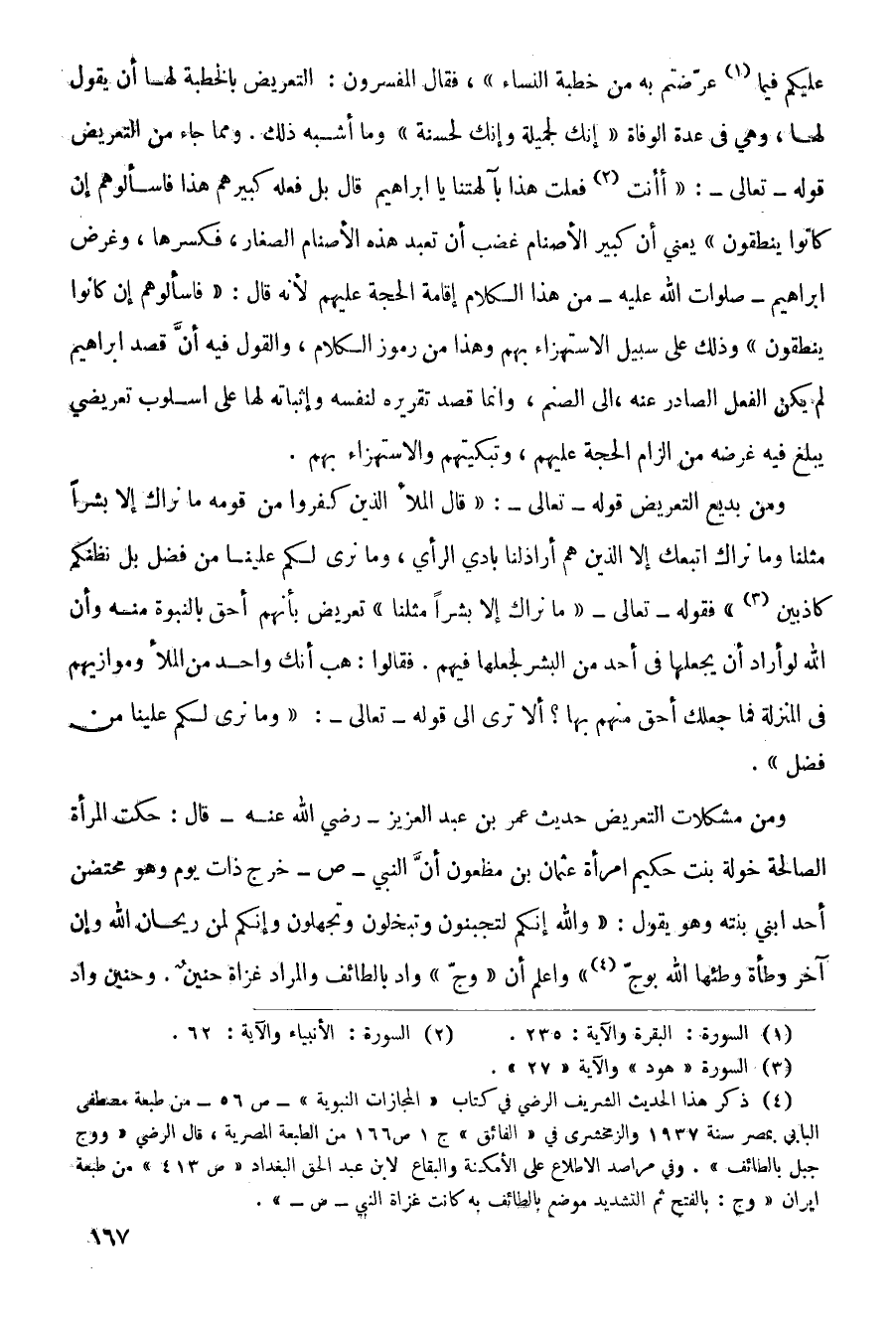 ومن مشكلات التعريض حديث عمر بن عبد العزيز - رضي الله عنه - قال: حكت المرأة الصالحة خولة بنت حكيم امرأة عثمان بن مظعون أن النبي - ص - خرج ذات يوم وهو محتضن أحد ابني بنته وهو يقول: (والله إنكم لتجبنون وتبخلون وتجهلون وإنكم لمن ريحان الله وان آخر وطأة وطئها الله بوجّ) واعلم أن (وج) واد بالطائف والمراد غزاة حنين. وحنين واد