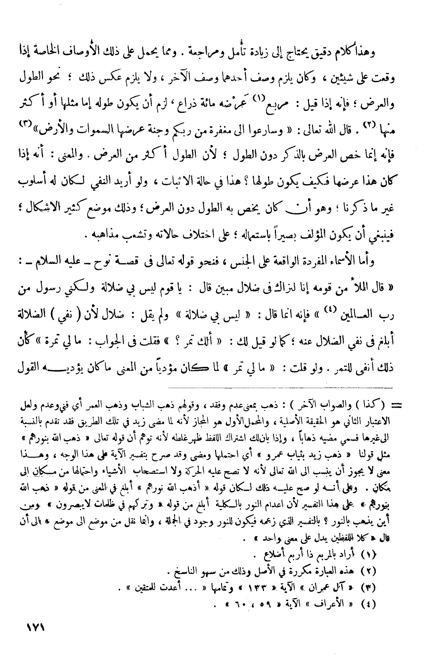 وهذا كلام دقيق يحتاج إلى زيادة تأمل ومراجعة. ومما يجعل على ذلك الأوصاف الخاصة إذا وقعت على شيئين، وكان يلزم وصف أحدهما وصف الآخر، ولا يلزم عكس ذلك؛ نحو الطول والعرض؛ فإنه إذا قيل: مربع عرضه مائه ذراع، لزم أن يكون طوله إما مثلها أو أكثر منها. قال الله تعالى: (وسارعوا إلى مغفرة من ربكم وجنة عرضها السموات والأرض) فإنه إنما خص العرض بالذكر دون الطول؛ لأن الطول أكثر من العرض. والمعنى: أنه إذا كان هذا عرضها فكيف يكون طولها؟ هذا في حالة الإثبات، ولو أريد النفي لكان له أسلوب غير ما ذكرنا؛ وهو أن كان يخص به الطول دون العرض؛ وذلك موضع كثير الاشكال؛ فينبغي أن يكون المؤلف بصيراً باستعماله؛ على اختلاف حالاته وتشعب مذاهبه.