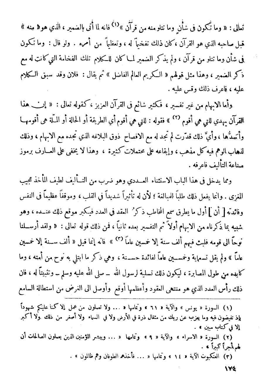 وأما الإبهام من غير تفسير، فكثير شائع في القرآن العزيز، كقوله تعالى: (إن هذا القرآن يهدي للتي هي أقوم) فقوله: للتي هي أقوم أي الطريقة أو الحالة أو الملة هي أقومها وأسدها، وأي ذلك قدرت لم تجد له مع الإفصاح ذوق البلاغة الذي تجده مع الإبهام، وذلك لذهاب الوهم فيه كل مذهب، وإيقاعه على محتملات كثيرة، وهذا لا يخفى على العارف برموز صناعة التأليف فاعرفه.