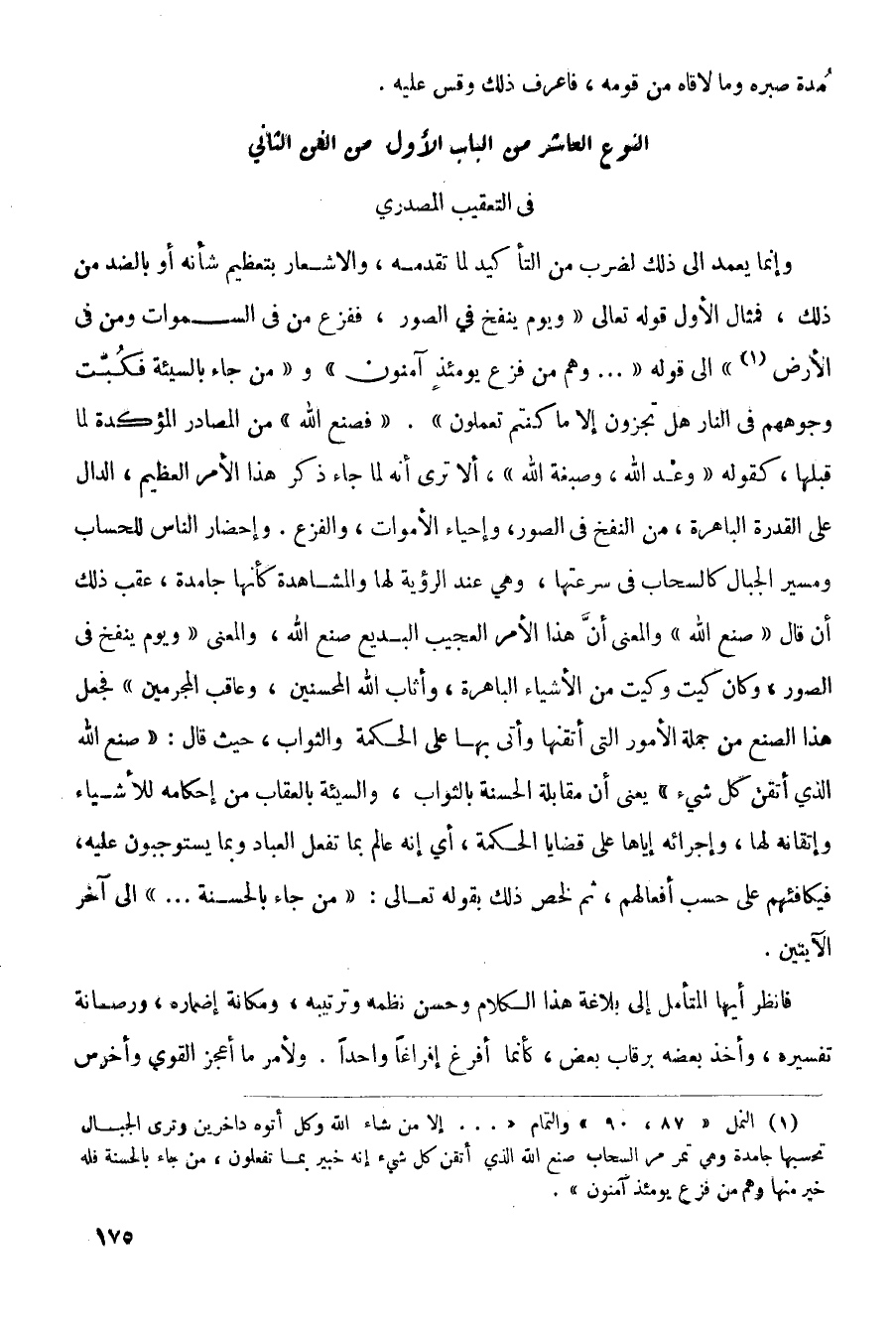 وإنما يعمد إلى ذلك لضرب من التأكيد لما تقدمه، والإشعار بتعظيم شأنه أو بالضد من ذلك، فمثال الأول قوله تعالى (ويوم ينفخ في الصور، ففزع من في السموات ومن في الأرض) إلى قوله (. . . وهم من فزع يومئذ آمنون) و (من جاء بالسيئة فكبت وجوههم في النار هل تجزون إلا ما كنتم تعملون). (فصنع الله) من المصادر المؤكدة لما قبلها، كقوله (وعْد الله، وصبغة الله)، ألا ترى أنه لما جاء ذكر هذا الأمر العظيم، الدال على القدرة الباهرة، من النفخ في الصور، وإحياء الأموات، والفزع. وإحضار الناس للحساب ومسير الجبال كالسحاب في سرعتها، وهي عند الرؤية لها والمشاهدة كأنها جامدة، عقب ذلك أن قال (صنع الله) والمعنى أن هذا الأمر العجيب البديع صنع الله، والمعنى (ويوم ينفخ في الصور، وكان كيت وكيت من الأشياء الباهرة، وأثاب الله المحسنين، وعاقب المجرمين)