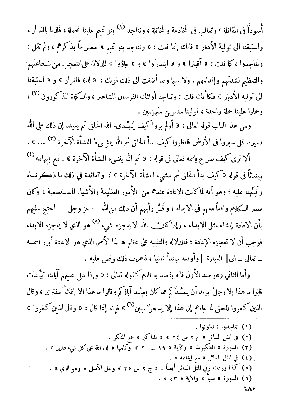 ألا ترى كيف صرح باسمه تعالى في قوله: (ثم الله ينشئ النشأة الآخرة). مع إبهامه مبتدئاً في قوله (كيف بدأ الخلق ثم ينشئ النشأة الآخرة)؟ والفائدة في ذلك ما ذكرناه ونبهنا عليه؛ وهو أنه لما كانت الإعادة عندهم من الأمور العظيمة والأشياء المستصبعة، وكان صدر الكلام واقعاً معهم في البداء، وقر رأيهم أن ذلك من الله - عز وجل - احتج عليهم بأن الإعادة إنشاء مثل الإبداء، وإذا كان الله لا يعجزه شيء هو الذي لا يعجزه الإبداء فوجب أن لا تعجزه الإعادة؛ فللدلالة والتنبيه على عظم هذا الأمر الذي هو الإعادة أبرز اسمه - تعالى - إلى (العبارة) وأوقعه مبتدأ ثانياً، فاعرف ذلك وقس عليه.