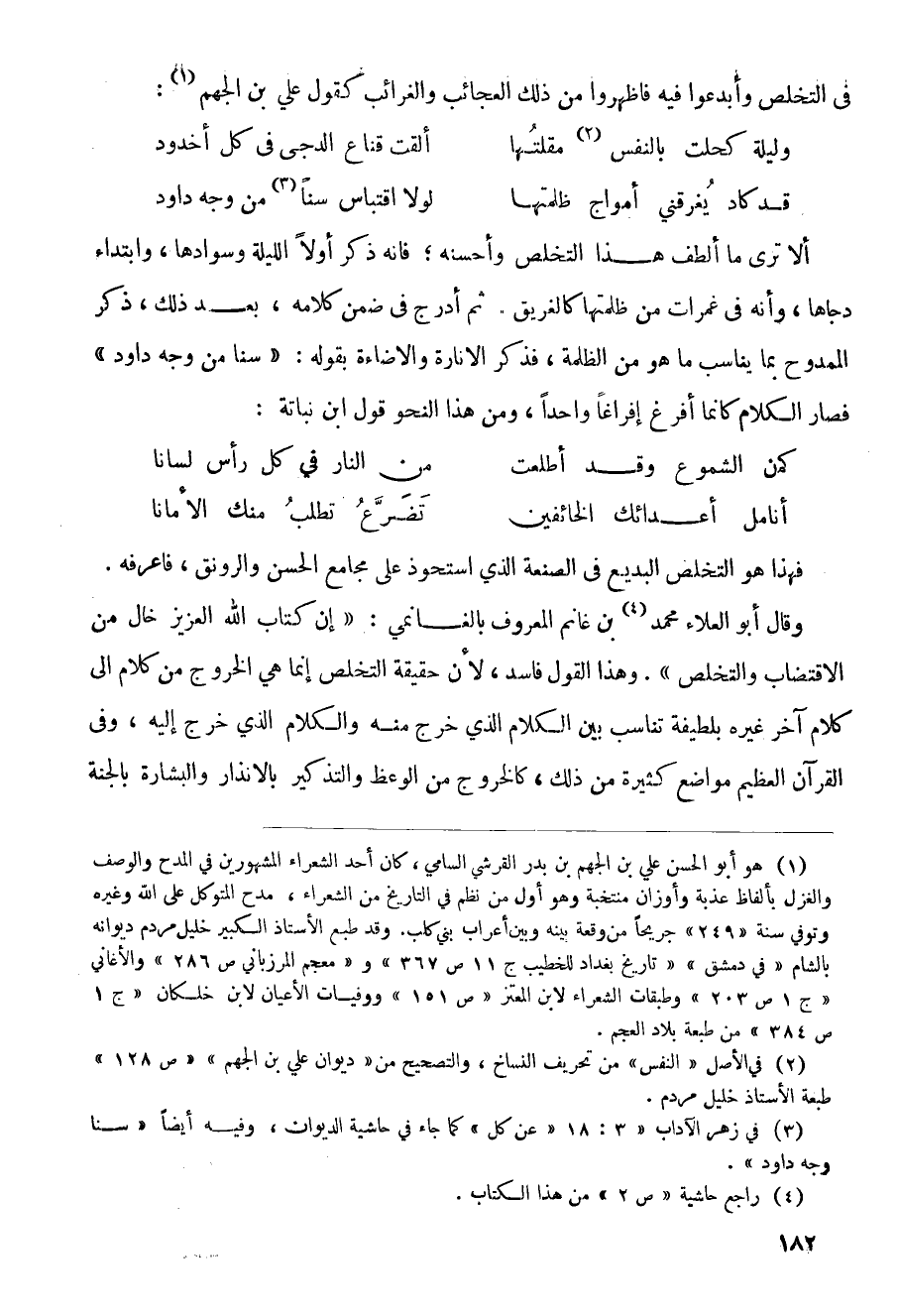 ألا ترى ما ألطف هذا التخلص وأحسنه؛ فانه ذكر أولاً الليلة وسوادها، وابتداء دجاها، وأنه في غمرات من ظلمتها كالغريق. ثم أدرج في ضمن كلامه، بعد ذلك، ذكر الممدوح بما يناسب ما هو من الظلمة، فذكر الإنارة والإضاءة بقوله: (سنا من وجه داود) فصار الكلام كأنما أفرغ إفراغاً واحداً، ومن هذا النحو قول