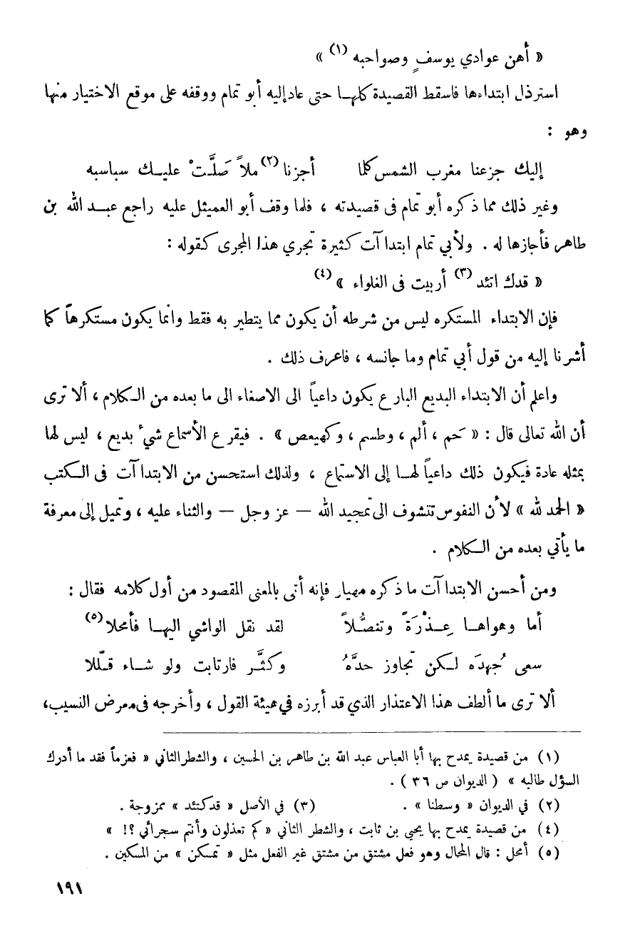 واعلم أن الابتداء البديع البارع يكون داعياً إلى الإصغاء إلى ما بعده من الكلام، ألا ترى أن الله تعالى قال: (حم، ألم، وطسم، وكهيعص). فيقرع الأسماع شيء بديع، ليس لها بمثله عادة فيكون ذلك داعياً لها إلى الاستماع، ولذلك استحسن من الابتداءات في الكتب (الحمد لله) لأن النفوس تتشوف إلى تمجيد الله - عز وجل - والثناء عليه، وتميل إلى معرفة ما يأتي بعده من الكلام.