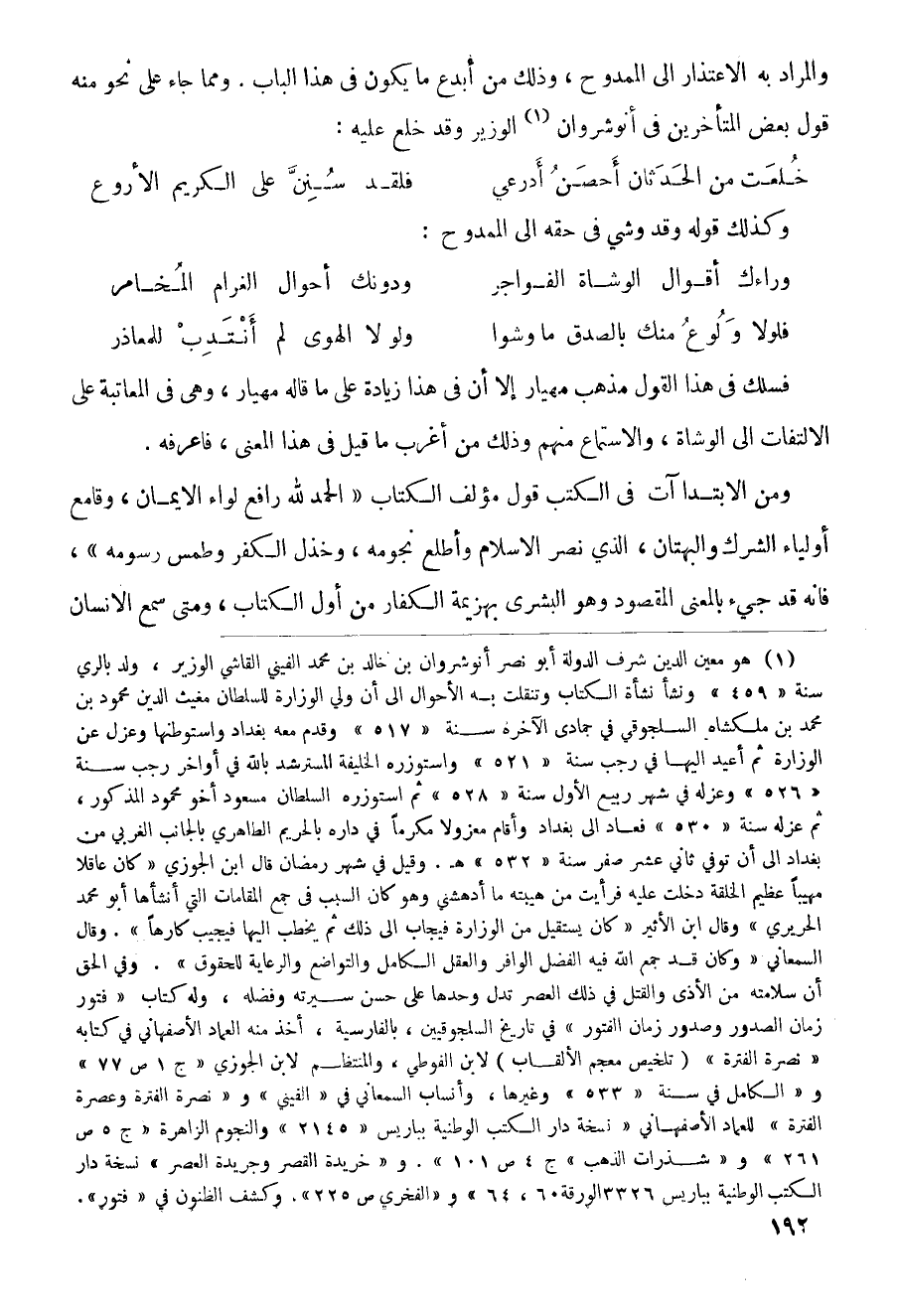 والمراد به الاعتذار إلى الممدوح، وذلك من أبدع ما يكون في هذا الباب. ومما جاء على نحو منه قول بعض المتأخرين في أنوشروان الوزير وقد خلع عليه: