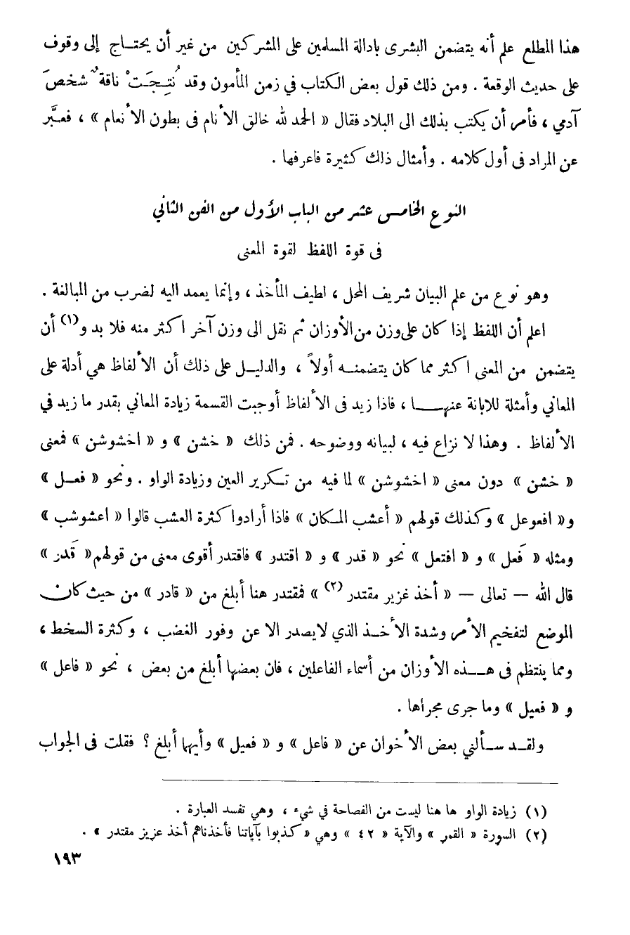 وهو نوع من علم البيان شريف المحل، لطيف المأخذ، وإنما يعمد إليه لضرب من المبالغة. أعلم أن اللفظ إذا كان على وزن من الأوزان ثم نقل إلى وزن آخر اكثر منه فلا بد وأن يتضمن من المعنى أكثر مما كان يتضمنه أولاً، والدليل على ذلك أن الألفاظ هي أدلة على المعاني وأمثلة للإبانة عنها، فإذا زيد في الألفاظ أوجبت القسمة زيادة المعاني بقدر ما زيد في الألفاظ. وهذا لا نزاع فيه، لبيانه ووضوحه. فمن ذلك (خشن) و (اخشوشن) فمعنى (خشن) دون معنى (اخشوشن) لما فيه من تكرير العين وزيادة الواو. ونحو (فعل) و (افعوعل) وكذلك قولهم (أعشب المكان) فإذا أرادوا كثرة العشب قالوا (اعشوشب) ومثله (فَعل) و (افتعل) نحو (قدر) و (اقتدر) فاقتدر أقوى معنى من قولهم (قَدر) قال الله - تعالى - (أخذ