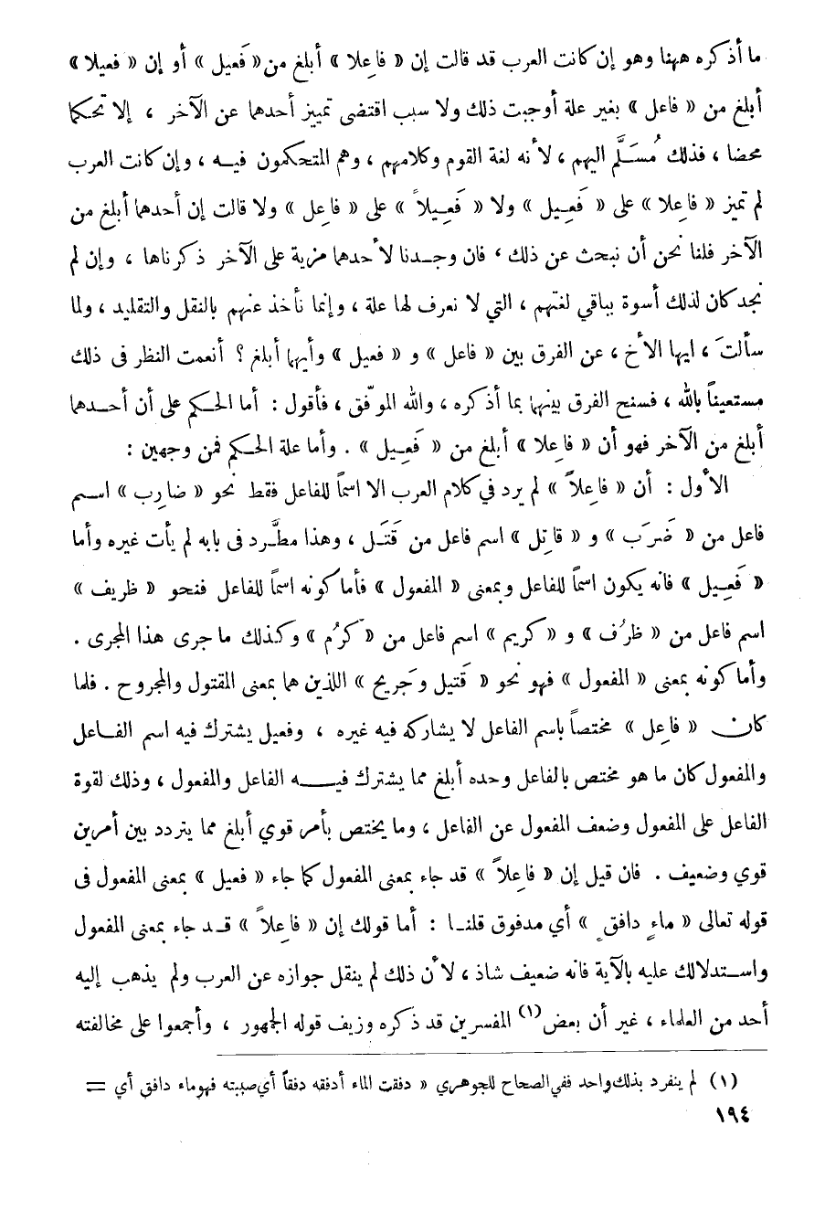 ما أذكره هاهنا هو إن كانت العرب قد قالت إن (فاعِلا) أبلغ من (فَعيل) أو إن (فعيلا) أبلغ من (فاعل) بغير علة أوجبت ذلك ولا سبب اقتضى تمييز أحدهما عن الآخر، إلا تحكما محضا، فذلك مُسَلَّم اليهم، لأنه لغة القوم وكلامهم، وهم المتحكمون فيه، وإن كانت العرب لم تميز (فاعِلا) على (فَعِيل) ولا (فَعِيلاً) على (فاعِل) ولا قالت إن أحدهما أبلغ من الآخر فلنا أن نبحث عن ذلك، فإن وجدنا لأحدهما مزية على الآخر ذكرناها، وإن لم نجد كان لذلك أسوة بباقي لغتهم، التي لا تعرف لها علة، وإنما بأخذ عنهم بالنقل والتقليد، ولما سألت، أيها الأخ، عن الفرق بين (فاعل) و (فعيل) وأيهما أبلغ؟ أنعمت النظر في ذلك مستعيناً بالله، فسنح الفرق بينهما بما أذكره، والله الموفق، فأقول: أما الحكم على أن أحدهما أبلغ من الآخر فهو أن (فاعلا) أبلغ من (فعيل). وأما علة الحكم فمن وجهين: