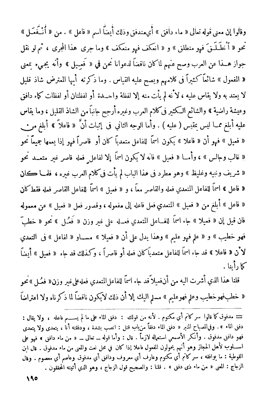 وقالوا إن معنى قوله تعالى (ماء دافق) أي مندفق وذلك أيضاً اسم (فاعل) من (أنْفَعَل) نحو (أنْطَلَقَ فهو منطلق) و (انعكف فهو منعكف) وما جرى هذا المجرى، ثم لو نقل جواز هذا عن العرب وصح عنهم لما كان ناقضاً لدعوانا نحن في (فَعيِل) وأنه يجيء بمعنى (المفعول) شائعاً كثيراً في كلامهم ويصح عليه القياس. وما ذكرته أيها المعترض شاذ قليل لا يعتد به ولا يقاس عليه، لأنه لم يأت منه إلا لفظة واحدة أو لفظتان أو لفظات كماء دافق وعيشة راضية) والشائع الكثير في كلام العرب وغيره أرجح جانباً من الشاذ القليل، وما يقاس عليه أبلغ مما ليس بمقيس (عليه). وأما الوجه الثاني في إثبات أن (فاعلاً) أبلغ من (فعيل) فهو أن فاعلاً يكون اسماً للفاعل معتدياً كان أو قاصراً فهو إذا يعمها جميعاً نحو (غالب وجالس)، وأما (فعيل) فإنه لا يكون اسماً إلا لفاعل فعله قاصر غير متعد نحو (شريف ونبيه وغليظ) وهو مطرد في هذا الباب لم يأت في كلام العرب غيره، فلما كان (فاعل) اسماً للفاعل المتعدي فعله والقاصر معاً، و (فعيل) اسماً للفاعل القاصر فعله فقط كان (فاعل) أبلغ من (فعيل) المتعدي فعل إلى مفعوله، وقصور فعل (فعيل) عن معموله فإن قيل إن (فعيلاً) جاء اسماً للفاعل المتعدي فعله على غير وزن (فَعُل) نحو (خطبَ فهو خطيب) و (علم فهو عليم) وهذا يدل على أن