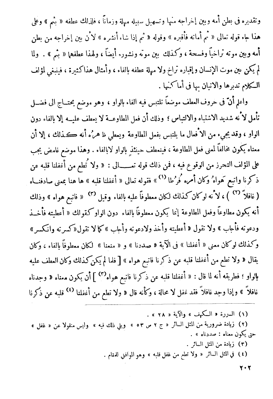 واعلم أن في حروف العطف موضعاً تلتبس فيه الفاء بالواو، وهو موضع يحتاج إلى فضل تأمل لأنه شديد الاشتباه والالتباس؛ وذلك أن فعل المطاوعة لا يعطف عليه إلا بالفاء دون الواو، وقد يجيء من الأفعال ما يلتبس بفعل المطاوعة ويعطي ظاهره أنه كذلك، إلا أن معناه يكون مخالفاً لمعنى فعل المطاوعة، فينعطف حينئذ بالواو لا بالفاء. وهذا موضع غامض يجب على المؤلف التحرز من الوقوع فيه، فمن ذلك قوله تعالى: (ولا تطع من أغفلنا قلبه عن ذكرنا واتبع هواه وكان أمره فرطا) فقوله تعالى (أغفلنا قلبه) هاهنا بمعنى صادفناه (غافلاً)، لأنه لو كان كذلك لكان معطوفاً عليه بالفاء وقيل (فاتبع هواه) وذلك أنه يكون مطاوعاً وفعل المطاوعة إنما يكون معطوفاً بالفاء دون الواو كقولك (أعطيته فأخذ ودعوته فأجاب) ولا تقول (أعطيته وأخذ ولا دعوته وأجاب) كما لا تقول (كسرته وانكسر) وكذلك لو كان معنى (أغفلنا) في الآية (صددنا) و (منعنا) لكان معطوفاً بالفاء، وكان يقال (ولا تطع من أغفلنا قلبه عن ذكرنا فاتبع هواه) فلما لم يكن كذلك وكان العطف عليه بالواو؛ فطريقه أنه لما قال: (أغفلنا قلبه عن ذكرنا فاتبع هواه أن يكون معناه (وجدناه غافلاً) وإذا وجد غافلاً فقد غفل لا محالة، وكأنه قال (ولا تطع من أغفلنا قلبه عن ذكرنا