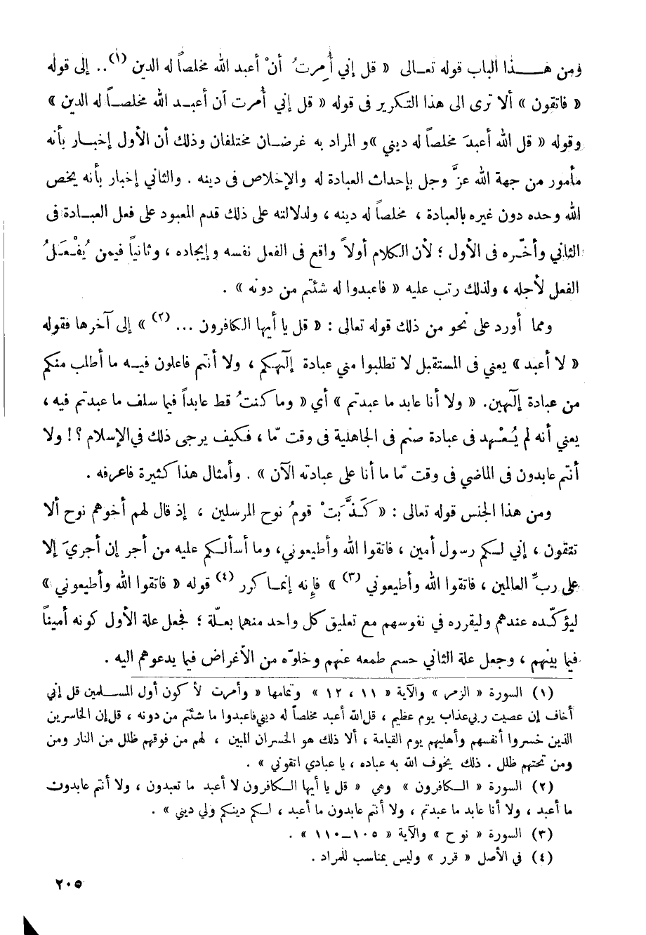 ومن هذا الباب قوله تعالى (قل أني أمرتُ أنْ أعبد الله مخلصاً له الدين. . .) إلى قوله (فاتقون) ألا ترى إلى هذا التكرير في قوله (قل إني أمرت أن أعبد الله مخلصاً له الدين) وقوله (قل الله أعبد مخلصاً له ديني) والمراد به غرضان مختلفان وذلك أن الأول إخبار بأنه مأمور من جهة الله عزَّ وجل بإحداث العبادة له والإخلاص في دينه. والثاني إخبار بأنه يخص الله وحده دون غيره بالعبادة، مخلصاً له دينه، ولدلالته على ذلك قدم المعبود على فعل العبادة في الثاني وأخره في الأول؛ لأن الكلام أولاً واقع في الفعل نفسه وإيجاده، وثانياً فيمن يفعل الفعل لأجله، ولذلك رتب عليه (فاعبدوا ما شئتم من دونه).
