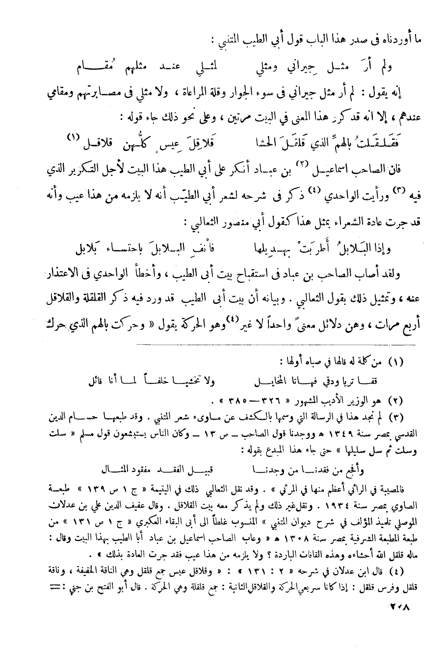 ولقد أصاب الصاحب بن عباد في استقباح بيت أبي الطيب، وأخطأ الواحدي في الاعتذار عنه، وتمثيل ذلك يقول الثعالبي. وبيانه أن بيت أبي الطيب قد ورد فيه ذكر القلقلة والقلاقل أربع مرات، وهن دلائل معنى واحداً لا غير5 وهو الحركة يقول (وحركت بالهم الذي حرك