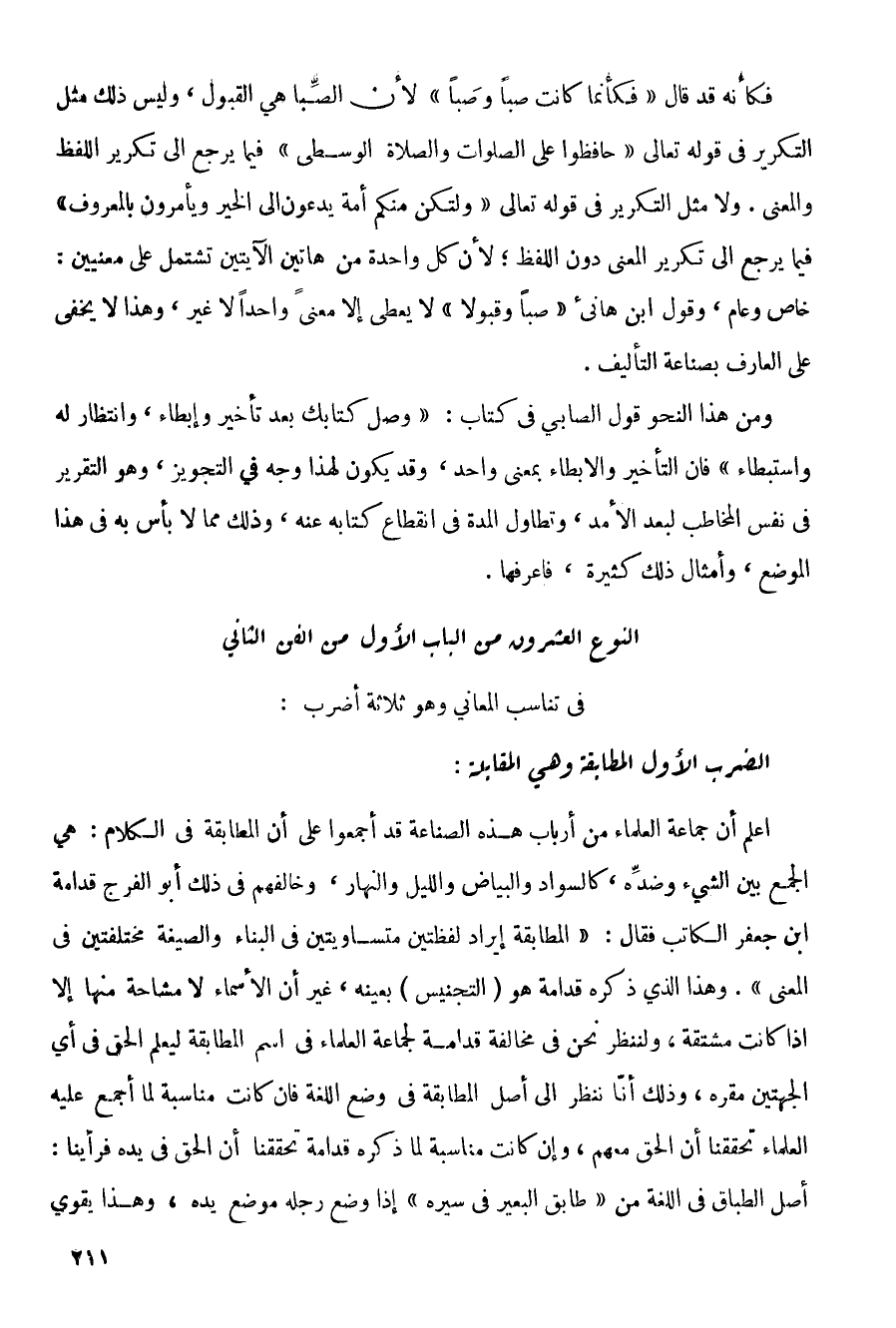 التكرير في قوله تعالى (حافظوا على الصلوات والصلاة الوسطى) فيما يرجع إلى تكرير اللفظ والمعنى. ولا مثل التكرير في قوله تعالى (ولتكن منكم أمة يدعون إلى الخير ويأمرون بالمعروف) فيما يرجع إلى تكرير المعنى دون اللفظ؛ لأن كل واحدة من هاتين الآيتين تشتمل على معنيين: خاص وعام، وقول ابن هانئ (صباً وقبولا) لا يعطى إلا معنى واحداً لا غير، وهذا لا يخفى على المعارف بصناعة التأليف.