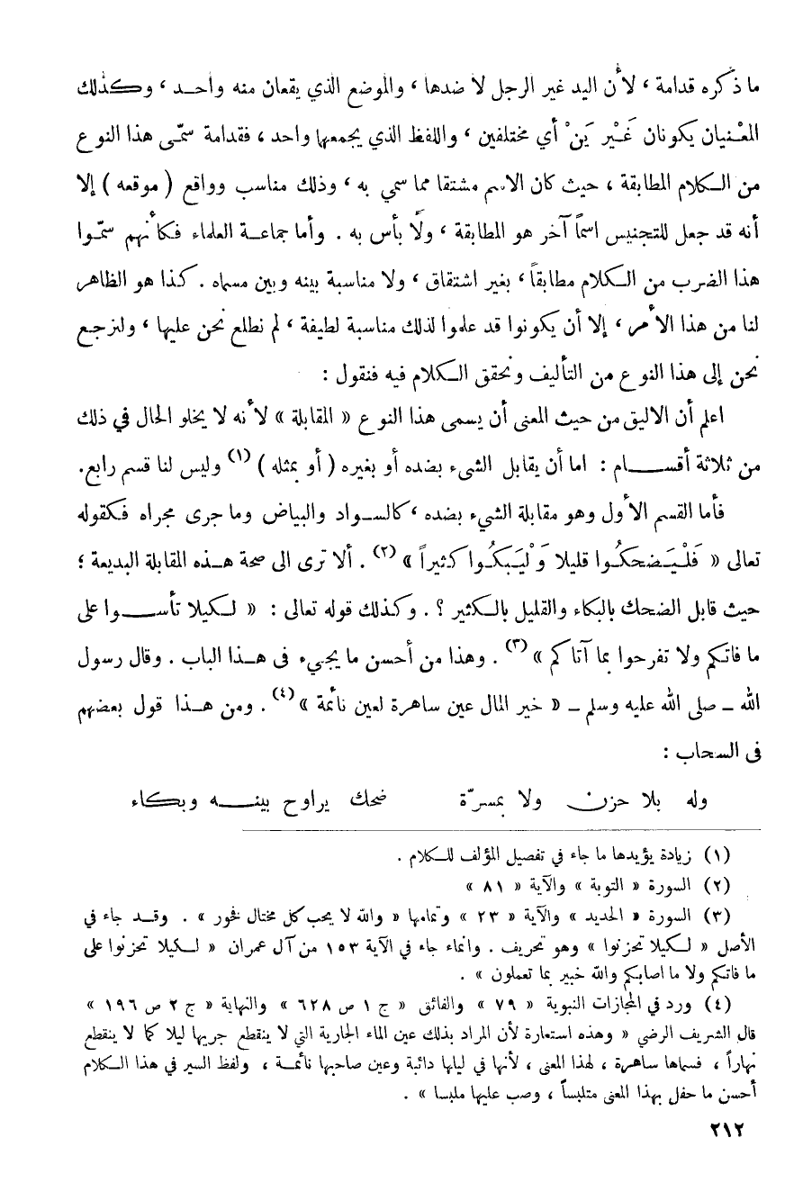 فأما القسم الأول وهو مقابلة الشيء بضده، كالسواد والبياض وما جرى مجراه فكقوله تعالى (فليضحكوا قليلا وليبكوا كثيراً). ألا ترى إلى صحة هذه المقابلة البديعة؛ حيث قابل الضحك بالبكاء والقليل بالكثير؟. وكذلك قوله تعالى: (لكيلا تأسوا على ما فاتكم ولا تفرحوا بما آتاكم). وهذا من أحسن ما يجيء في هذا الباب. وقال رسول الله - صلى الله عليه وسلم - (خير المال عين ساهرة لعين نائمة). ومن هذا قول بعضهم في السحاب: