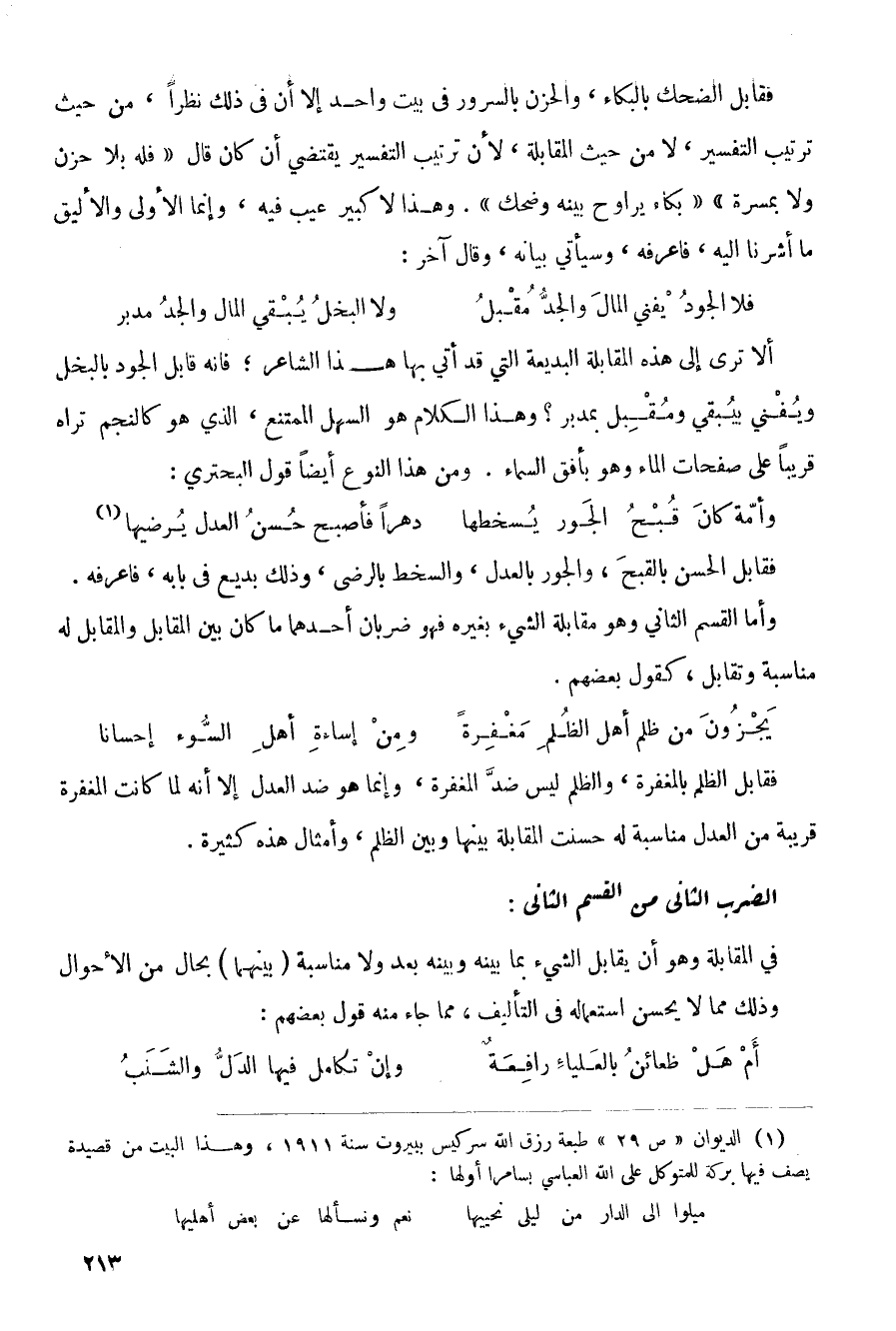 فقابل الضحك بالبكاء، والحزن بالسرور في بيت واحد إلا أن في ذلك نظراً، من حيث ترتيب التفسير، لا من حيث المقابلة، لأن ترتيب التفسير يقتضي أن كان قال