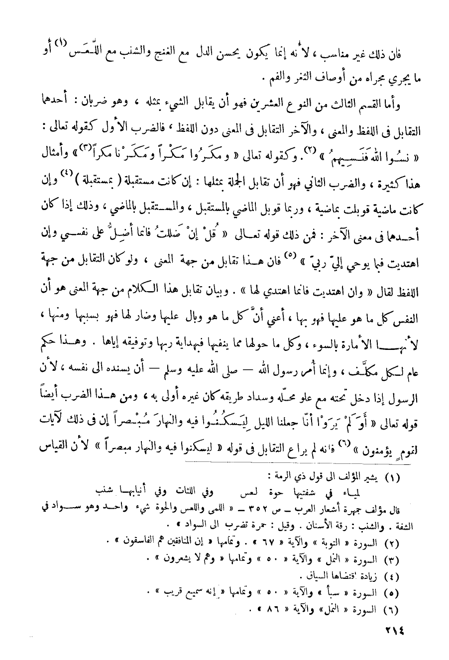 وأما القسم الثالث من النوع العشرين فهو أن يقابل الشيء بمثله، وهو ضربان: أحدهما التقابل في اللفظ والمعنى، والآخر التقابل في المعنى دون اللفظ، فالضرب الأول كقوله تعالى: (نسوا الله فنسيهم). وكقوله تعالى (ومكروا مكراً ومكرنا مكراً) وأمثال هذا كثيرة، والضرب الثاني فهو أن تقابل الجملة بمثلها: إن كانت مستقبلة (بمستقبلة) وأن كانت ماضية قوبلت بماضية، وربما قوبل الماضي بالمستقبل، والمستقبل بالماضي، وذلك إذا كان أحدهما في معنى الآخر: فمن ذلك قوله تعالى (قل إن ضللت فإنما أضل على نفسي وإن اهتديت فيما يوحي إلي ربي) فإن هذا تقابل من جهة المعنى، ولو كان التقابل من جهة اللفظ لقال (وإن اهتديت فإنما أهتدي لها). وبيان تقابل هذا الكلام من جهة المعنى هو أن النفس كل ما هو عليها فهو بها، أعني أن كل ما هو وبال عليها وضار لها فهو بسببها ومنها، لأنها الأمارة بالسوء، وكل ما حولها مما ينفيها فبهداية ربها وتوفيقه إياها. وهذا حكم عام لكل مكلف، وإنما أمر رسول الله - صلى الله عليه وسلم - أن يسنده إلى نفسه، لأن الرسول إذا دخل تحته مع علو محله وسداد طريقه كان غيره أولى به، ومن هذا الضرب أيضاً قوله تعالى (أو لم يروا أنا جعلنا الليل ليسكنوا فيه والنهار مبصراً إن في ذلك لآيات لقوم يؤمنون) فإنه لم يراع التقابل في قوله (ليسكنوا فيه والنهار مبصراً) لأن القياس
