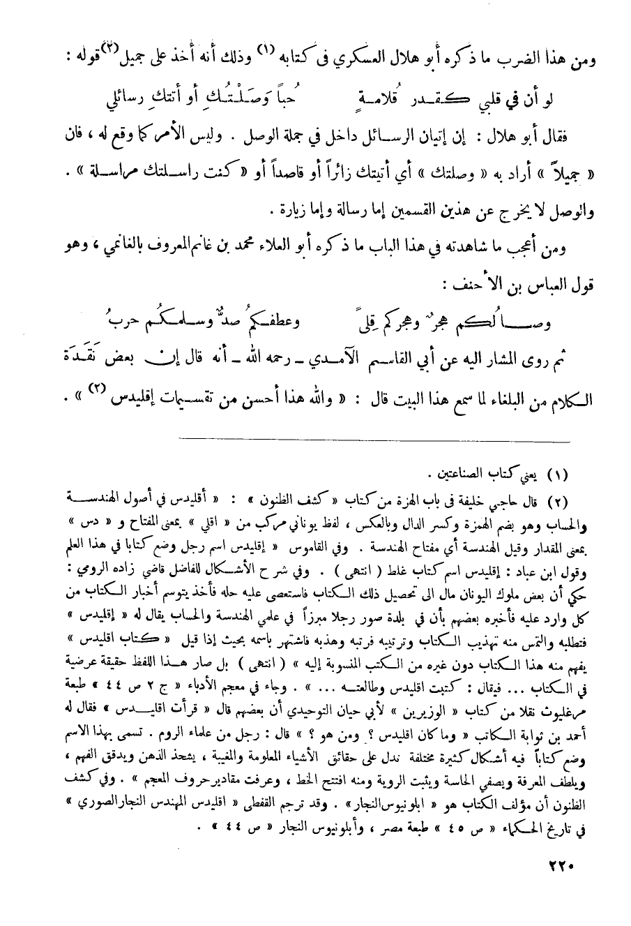فقال أبو هلال: إن إتيان الرسائل داخل في جملة الوصل. وليس الأمر كما وقع له، فإن (جميلاً) أراد به (وصلتك) أي أتيتك زائراً أو قاصداً أو (كنت راسلتك مراسلة). والوصل لا يخرج عن هذين القسمين إما رسالة وإما زيارة.