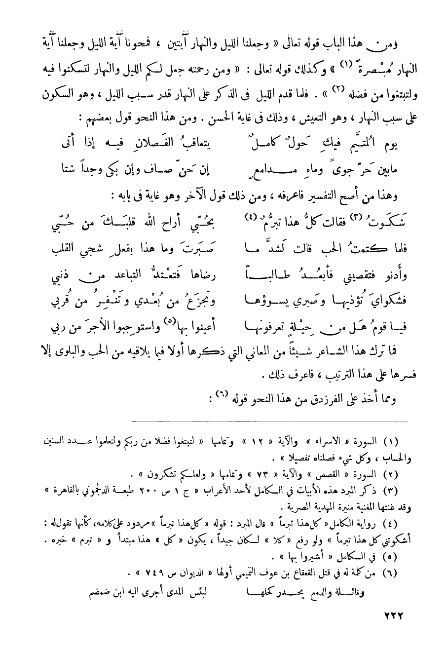 ومن هذا الباب قوله تعالى (وجعلنا الليل والنهار آيتين، فمحونا آية الليل وجعلنا آية النهار مبصرة) وكذلك قوله تعالى: (ومن رحمته جعل لكم الليل والنهار لتسكنوا فيه ولتبتغوا من فضله). فلما قدم الليل في الذكر على النهار قدر سبب الليل، وهو السكون على سبب النهار، وهو التعيش، وذلك في غاية الحسن. ومن هذا النحو قول بعضهم: