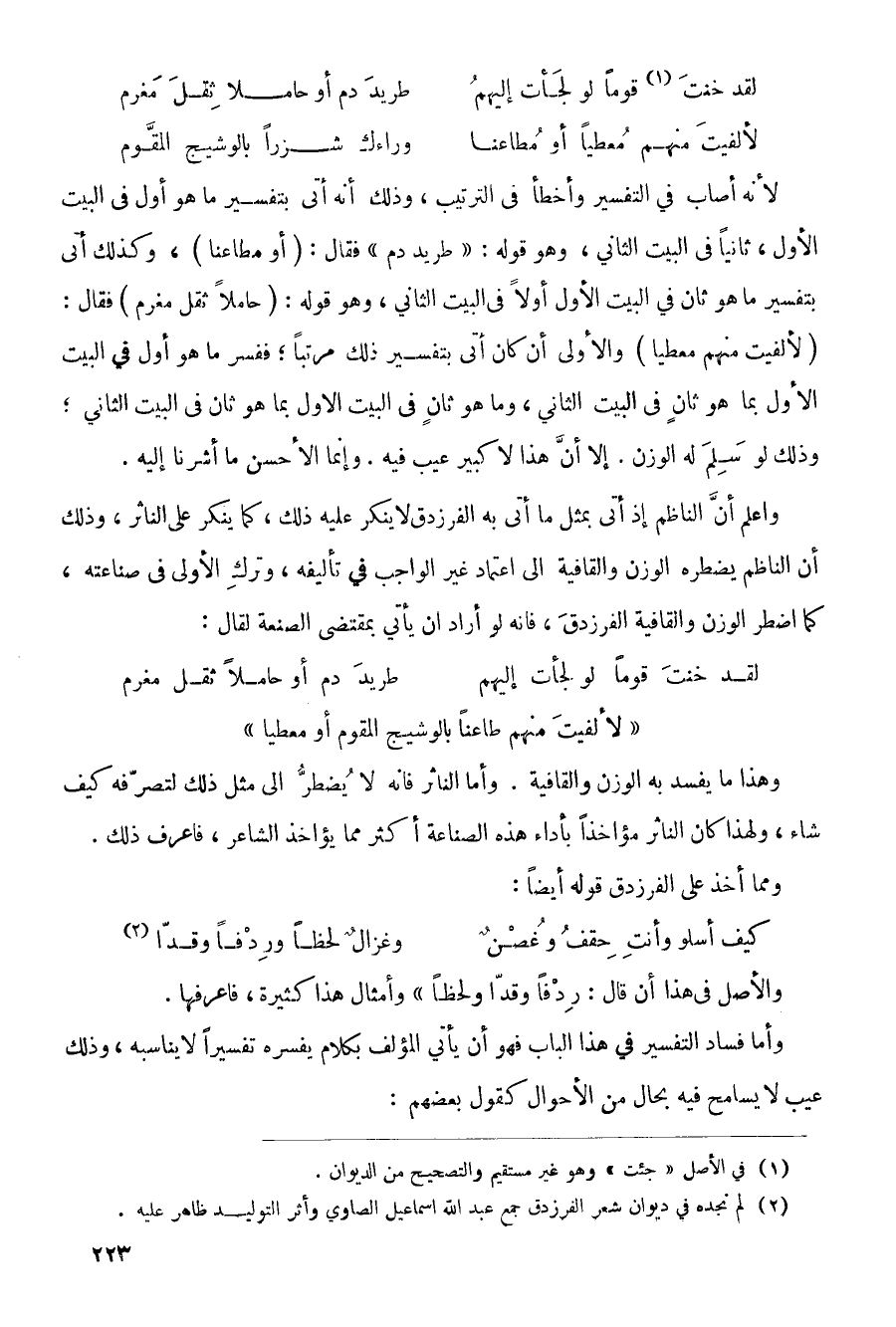 واعلم أن الناظم إذ أتى بمثل ما أتى به الفرزدق لا ينكر عليه ذلك، كما ينكر على الناثر، وذلك أن الناظم يضطره الوزن والقافية إلى اعتماد غير الواجب في تأليفه، وترك الأولى في صناعته، كما اضطر الوزن والقافية الفرزدق، فإنه لو أراد أن يأتي بمقتضى الصنعة لقال: