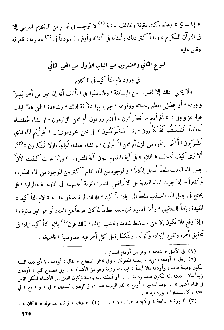 ولا يجيء ذلك إلا لضرب من المبالغة، وفائدتها في التأليف أنه إذا عبر عن أمر بعز وجوده، أو فعل يعظم إحداثه ووقوعه، جيء بها محققة لذلك، وشاهدة، فمن هذا الباب قوله عز وجل: (أفرايتم ما تحرثون، أأنتم تزرعون أم نحن الزارعون، لو نشاء لجعلناه حطاماً فظلتم تفكهون، إنا لمغرمون، بل نحن محرومون، أفرأيتم الماء الذي نشربون، أأنتم أنزلتوه من المزن أم نحن المنزلون، لو نشاء جعلناه أجاجاً فلولا تشكرون). ألا ترى كيف أدخلت (اللام) في آية المطعوم دون آية المشروب، وإنما جاءت كذلك لأن جعل الماء العذب ملحاً أسهل إمكاناً، والموجود من الماء الملح أكثر من الموجود من الماء العذب، وكثيراً ما إذا جرت المياه العذبة على الأراضي المتغيرة التربة أحالتها إلى الملوحة والمرارة، فلم يحتج في