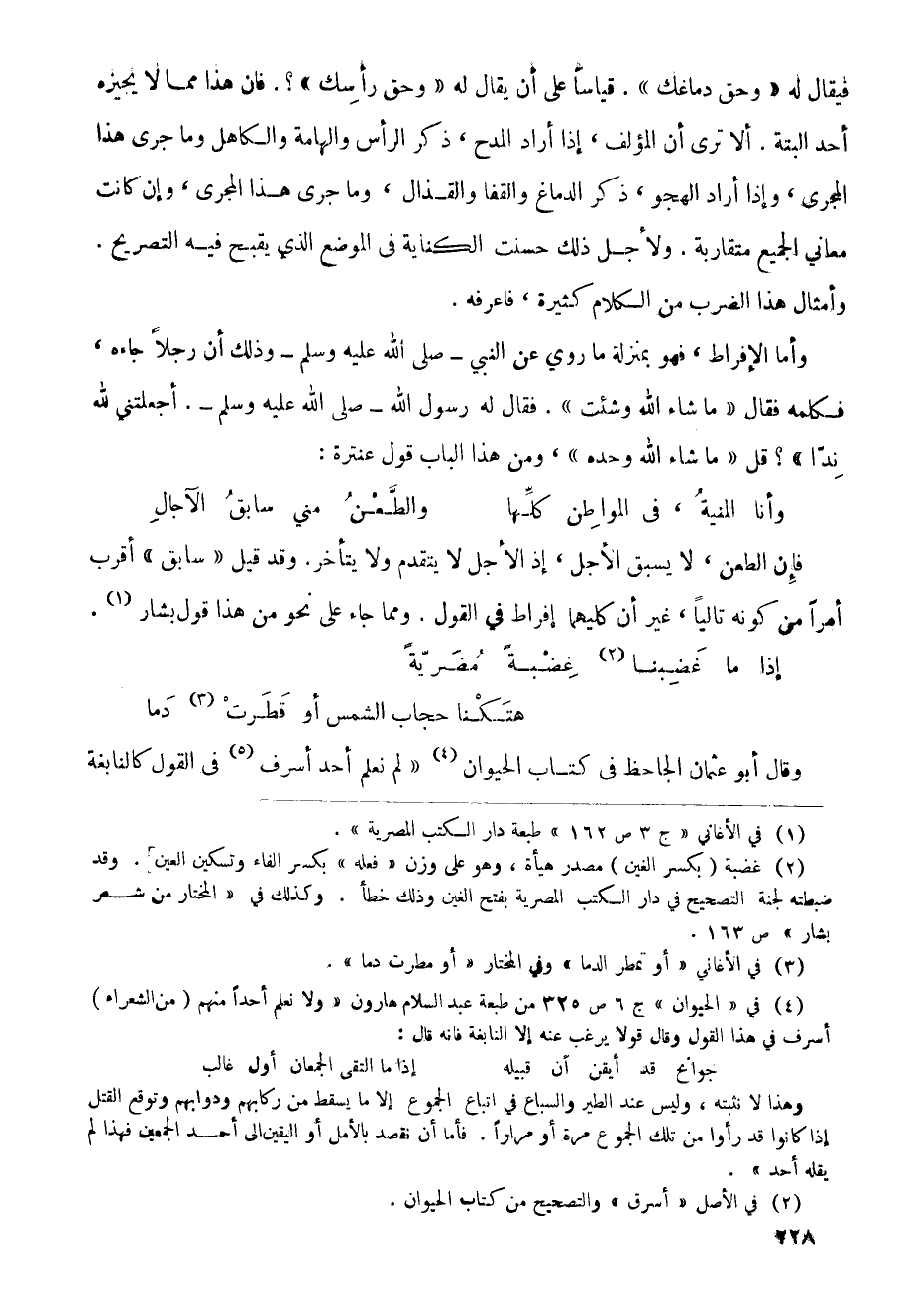 وأما الإفراط، فهو بمنزله ما روي عن النبي - صلى الله عليه وسلم - وذلك أن رجلاً جاءه، فكلمه فقال (ما شاء الله وشئت). فقال له رسول الله - صلى الله عليه وسلم - (أجعلتني لله نداً)؟ قل (ما شاء الله وحده)، ومن هذا الباب قول عنترة: