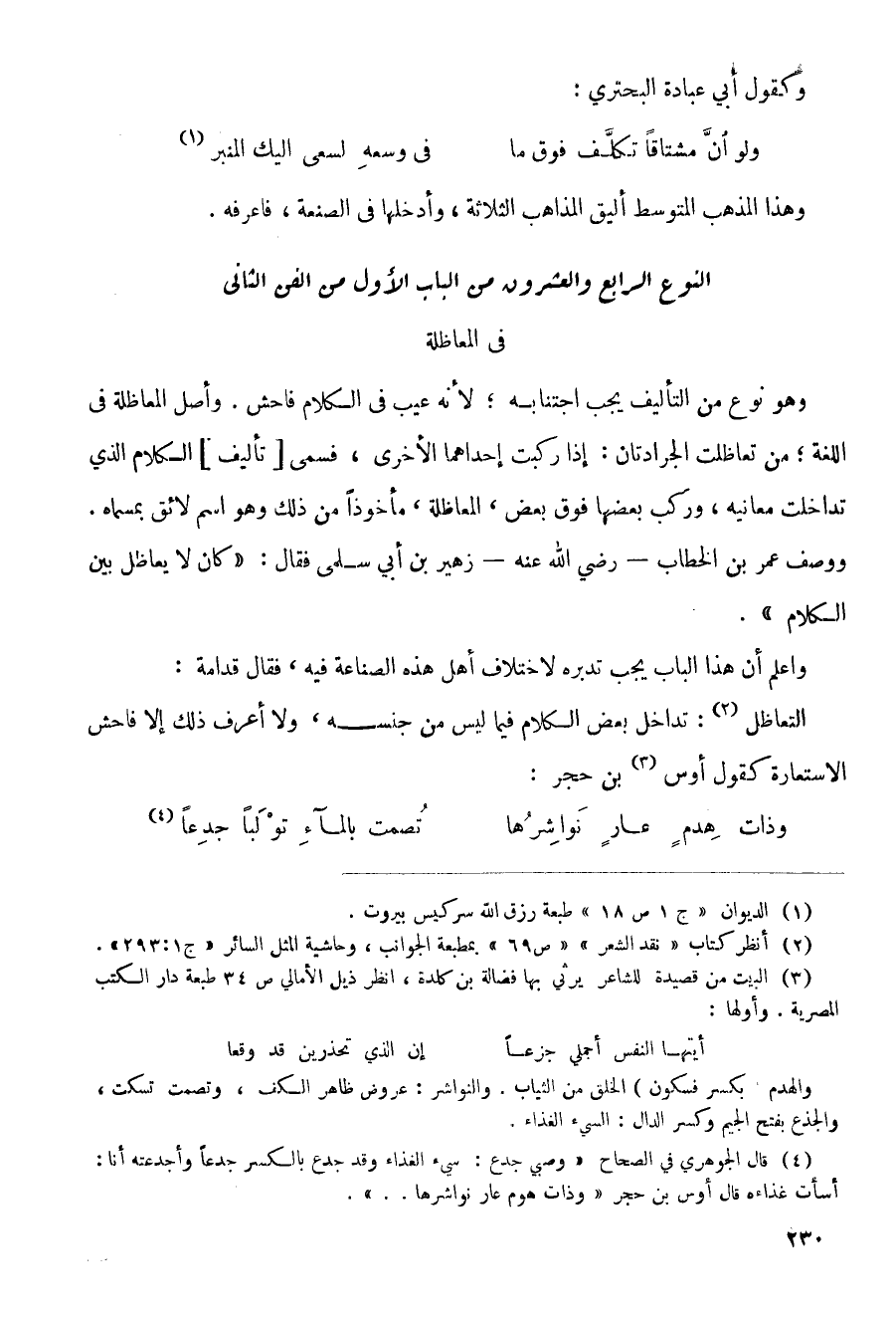 واعلم أن هذا الباب يجب تدبره لاختلاف أهل هذه الصناعة فيه فقال قدامة: