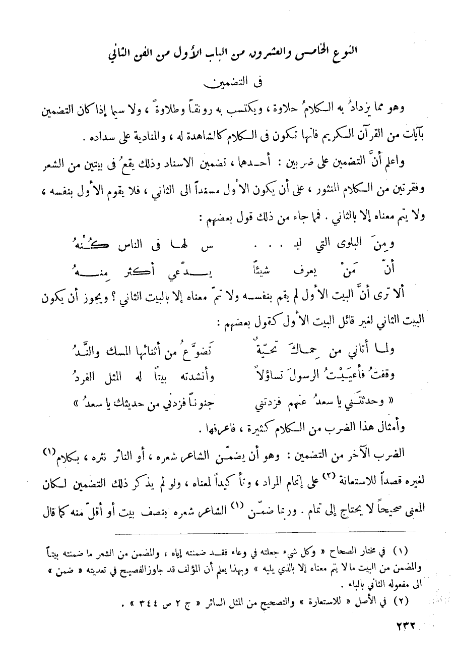 واعلم أن التضمين على ضربين: أحدهما، تضمين الإسناد وذلك يقع في بيتين من الشعر وفقرتين من الكلام المنشور، على أن يكون الأول مسنداً إلى الثاني، فلا يقوم الأول بنفسه، ولا يتم معناه إلا بالثاني. فما جاء من ذلك قول بعضهم: