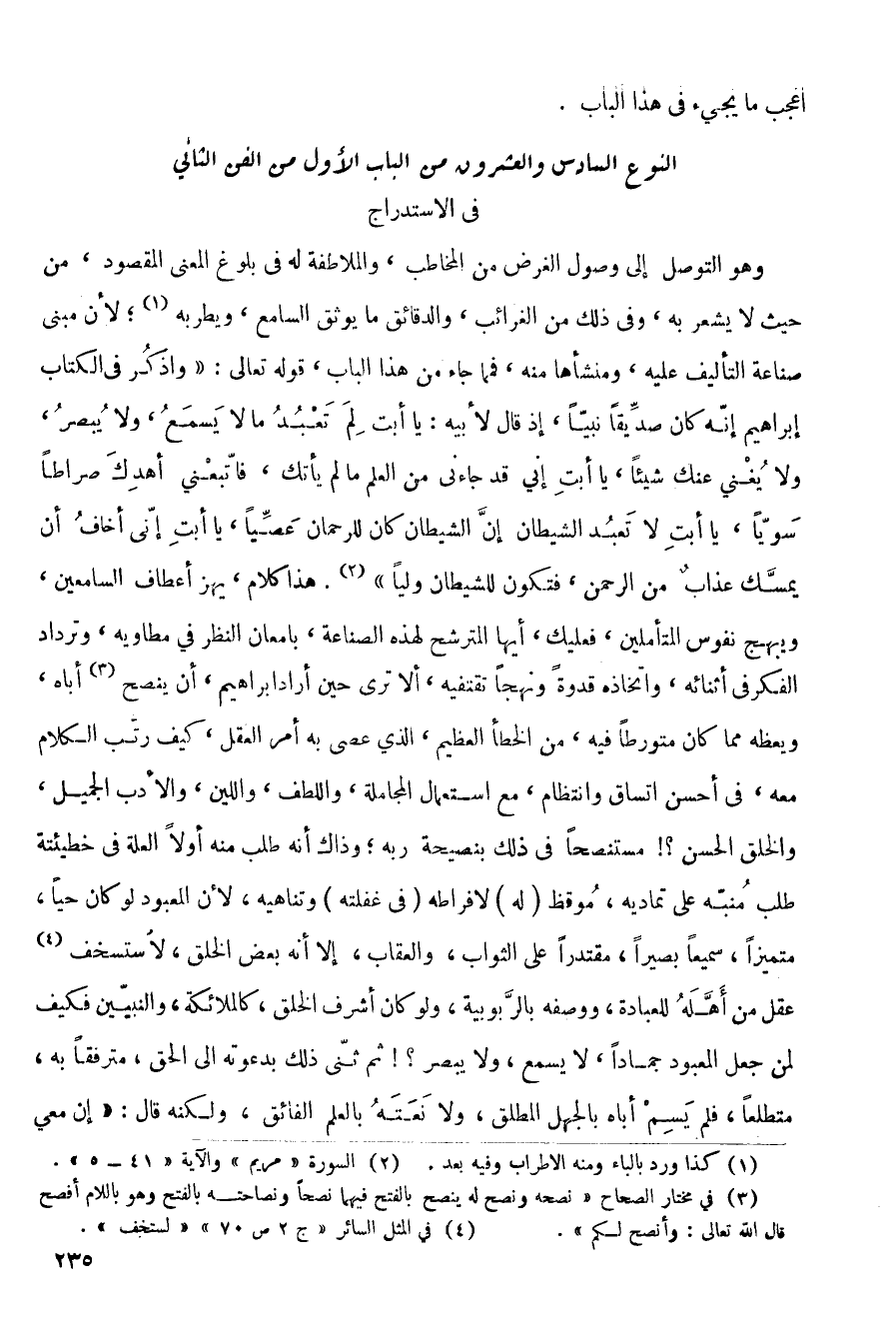 وهو التوصل إلى وصول الغرض من المخاطب، والملاطفة له بلوغ المعنى المقصود، من حيث لا يشعر به، وفي ذلك من الغرائب، والدقائق ما يوثق السامع، ويطربه؛ لأن مبنى صناعة التأليف عليه، ومنشأها منه، فما جاء من هذا الباب، قوله تعالى: (واذكر في الكتاب إبراهيم إنه كان صديقاً نبياً، إذ قال لأبيه: يا أبت لم تعبد مالا يسمع، ولا يبصر، ولا يغني عنك شيئاً، يا أبت إني قد جاءني من العلم ما لم يأتك، فاتبعني أهدك صراطاً سوياً، يا أبت لا تعبد الشيطان إن الشيطان كان للرحمن عصياً، يا أبت إني أخاف أن يمسك عذاب من الرحمن، فتكون للشيطان ولياً). هذا كلام، يهز أعطاف السامعين، ويبهج نفوس المتأملين، فعليك، أيها المترشح لهذه الصناعة، بإمعان النظر في مطاويه، وترداد الفكر في أثنائه، واتخاذه قدوة ونهجاً تقتفيه، ألا ترى حين أراد إبراهيم، أن ينصح أباه، ويعظه مما كان متورطاً فيه، من الخطأ العظيم، الذي عصى به أمر العقل، كيف رتب الكلام معه، في أحسن اتساق وانتظام، مع استعمال المجاملة، واللطف، واللين، والأدب الجميل، والخلق الحسن؟! مستنصحاً في ذلك بنصيحة ربه؛ وذاك أنه طلب منه أولاً العلة في خطيئته طلب منبه على تماديه، موقظ (له) لإفراطه (في غفلته) وتناهيه، لأن المعبود لو كان حباً، متميزاً، سميعاً بصيراً، مقتدراً على الثواب، والعقاب، إلا أنه بعض الخلق، لاستسخف عقل من أهله للعبادة، ووصفه
